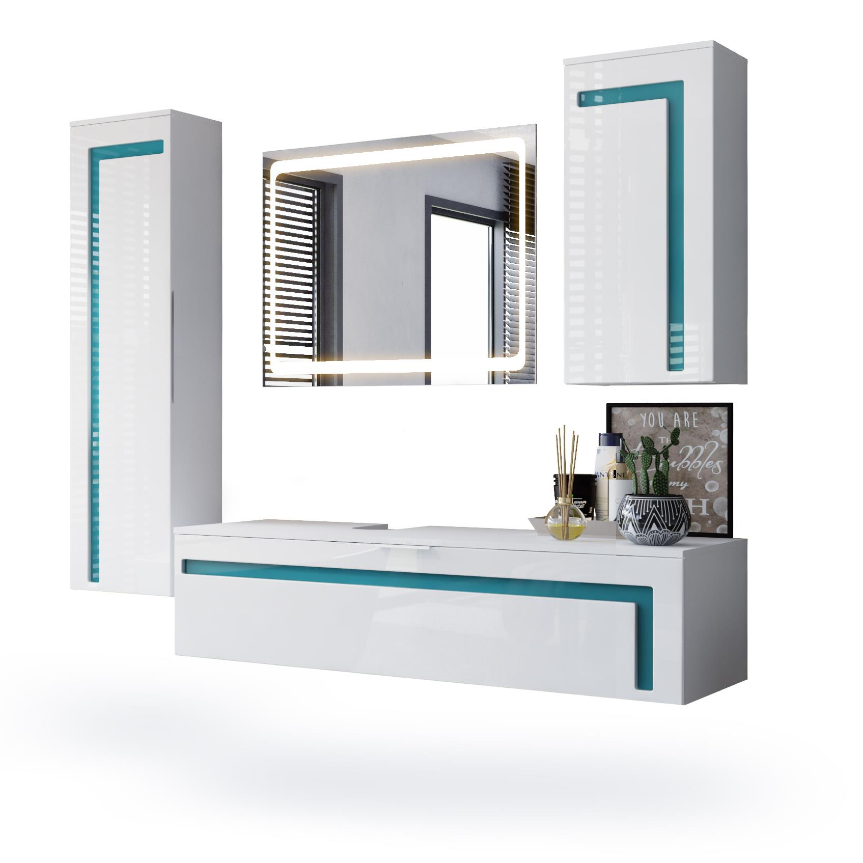 Produktinformationen "Badmöbel Set Aloha 4-tlg. 1 Unterschrank und 1 LED Spiegel Weiß matt&glänzend, Absetzungen in Petrol glänzend (210x51x185 cm)"