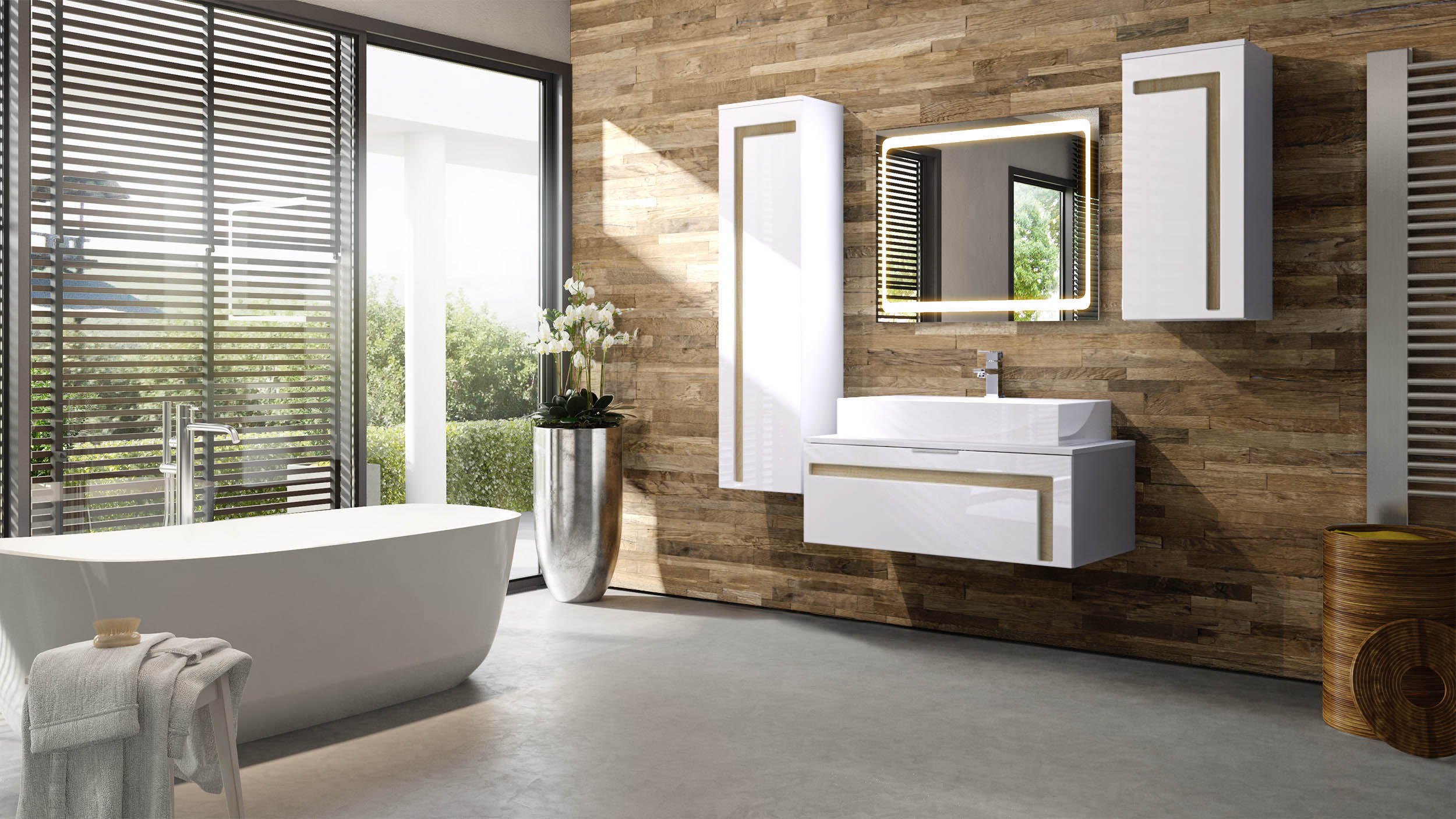 Das Badmöbelset Aloha V2 eignet sich hervorragend für geräumige Badezimmer. Es besteht aus einem hängenden Waschbeckenunterschrank mit Aufsatzwaschbecken und zwei Hängeschränken. Der Unterschrank ist mit einer Klappe ausgestattet. Hinter der Tür des großen Hängeschranks befinden sich vier verstellbare Einlegeböden, der kleinere Schrank ist mit zwei verstellbaren Glaseinlegeböden versehen. Hinter der Klappe des Unterschranks befinden sich zwei geräumige Fächer. Die Türen und die Klappe sind mit Softclosescharnieren versehen.