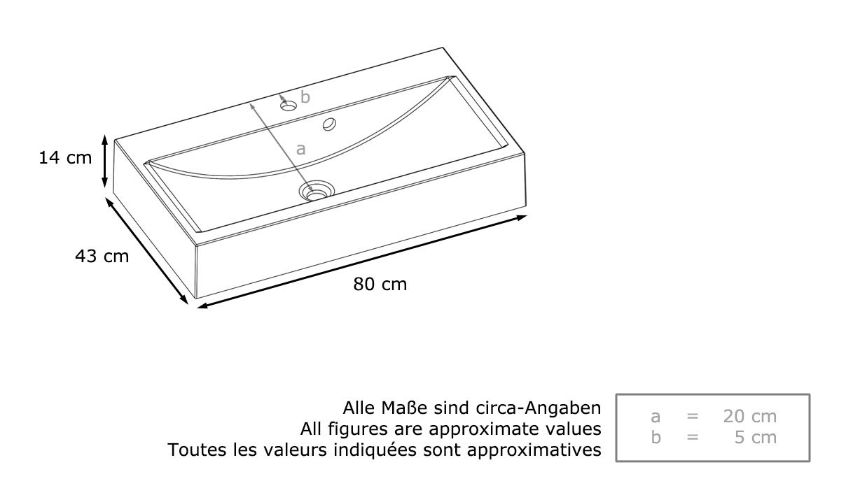Maße des Waschbeckens in cm (BxHxT): 80 x 13,5 x 43