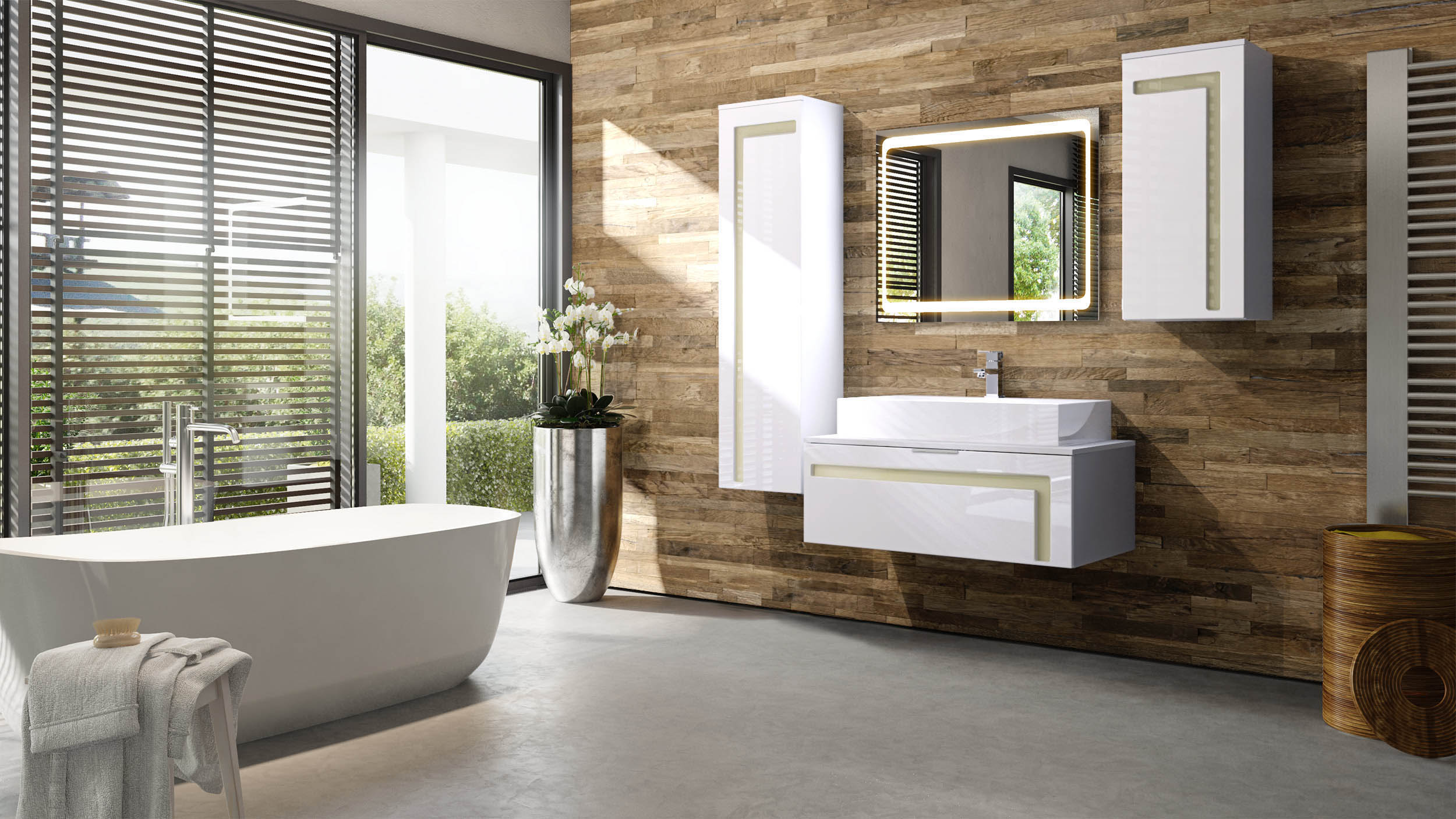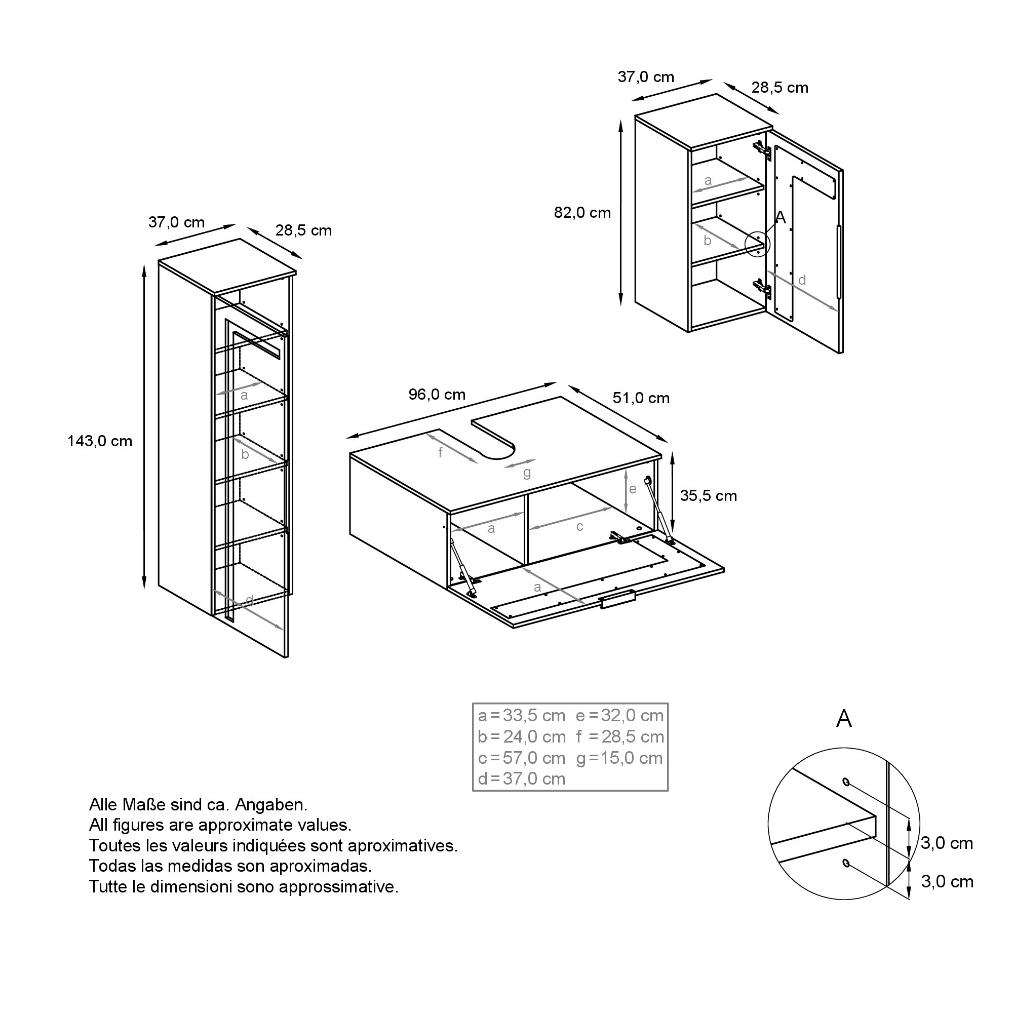Stellmaße der Badmöbel wie abgebildet in cm (BxHxT): 189 x 193 x 51