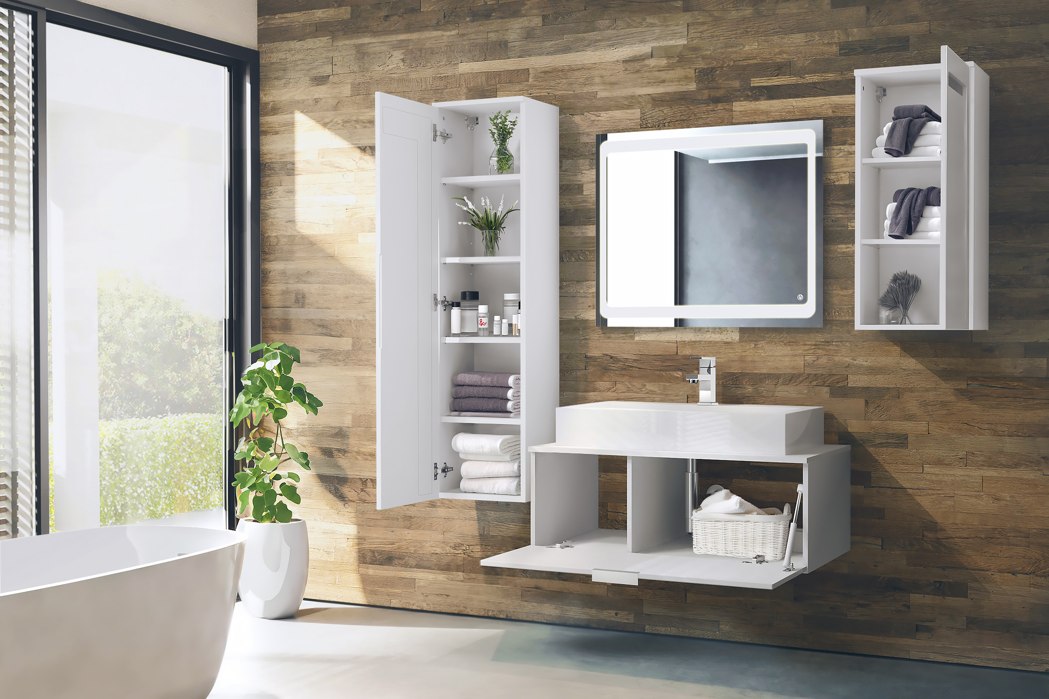 Das Badmöbelset Aloha V2 eignet sich hervorragend für geräumige Badezimmer. Es besteht aus einem hängenden Waschbeckenunterschrank mit Aufsatzwaschbecken und zwei Hängeschränken. Der Unterschrank ist mit einer Klappe ausgestattet. Hinter der Tür des großen Hängeschranks befinden sich vier verstellbare Einlegeböden, der kleinere Schrank ist mit zwei verstellbaren Glaseinlegeböden versehen. Hinter der Klappe des Unterschranks befinden sich zwei geräumige Fächer. Die Türen und die Klappe sind mit Softclosescharnieren versehen.