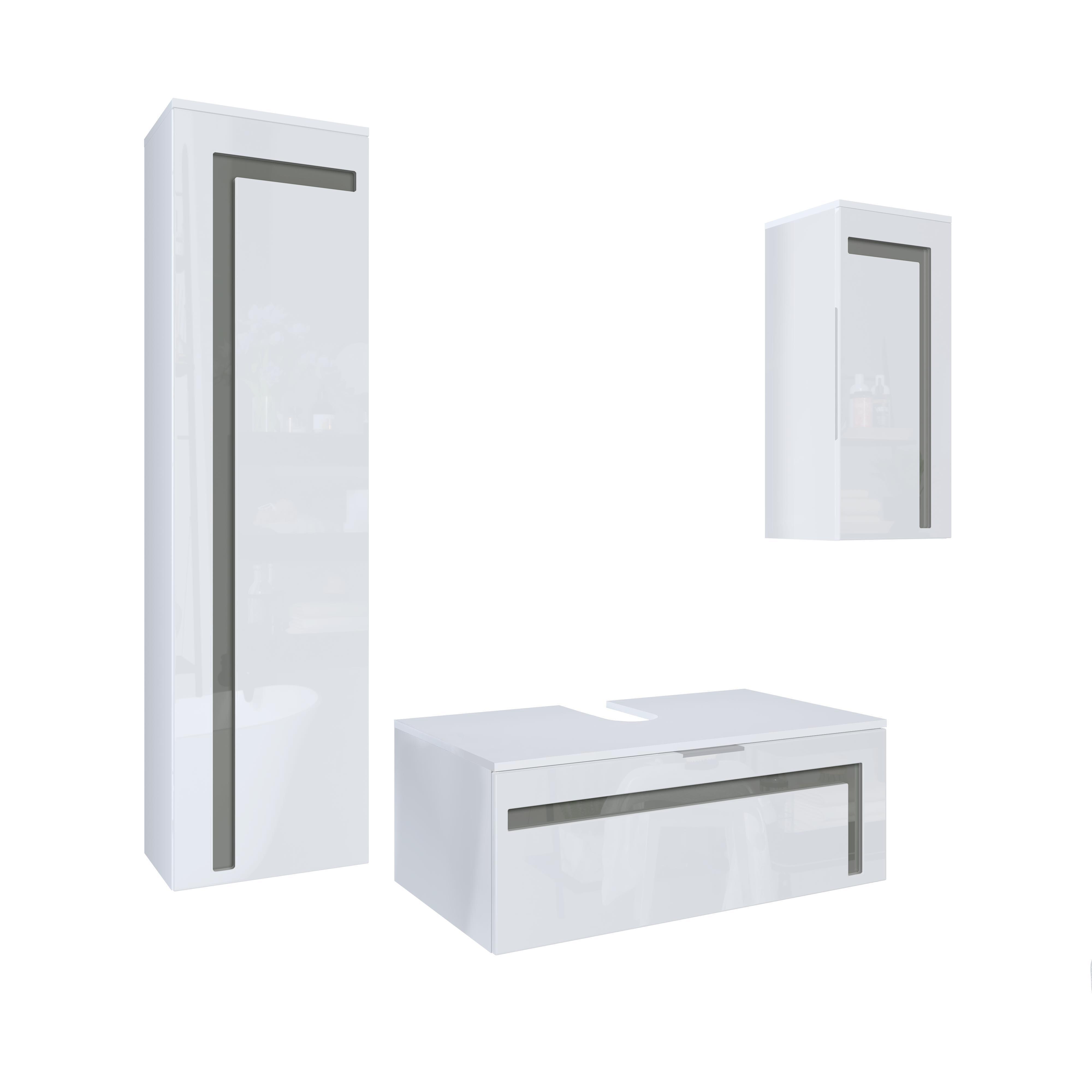 Produktinformationen "Badmöbel-Set Aloha V2 mit 2 Hochschränken und 1 Unterschrank Weiß matt/Weiß Hochglanz, Absetzungen in Grau Hochglanz (189x193x51cm)"