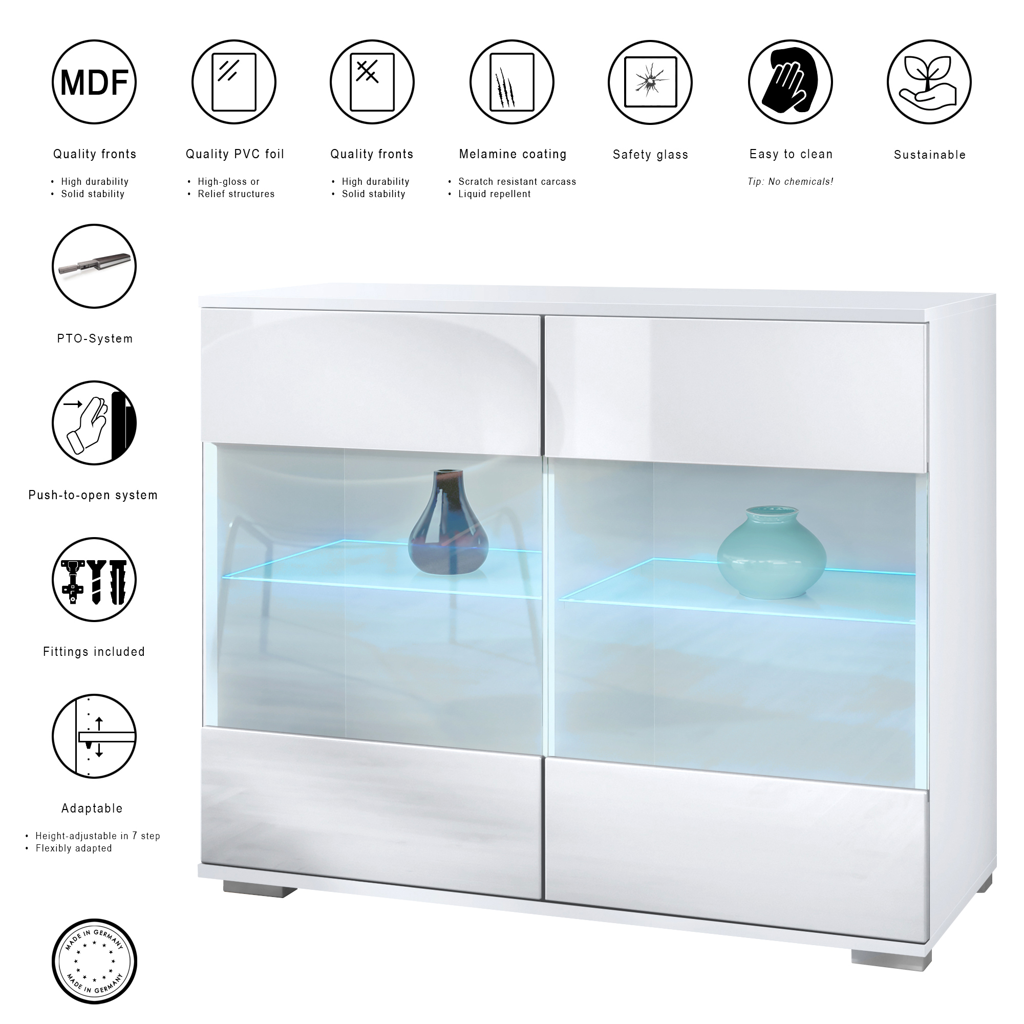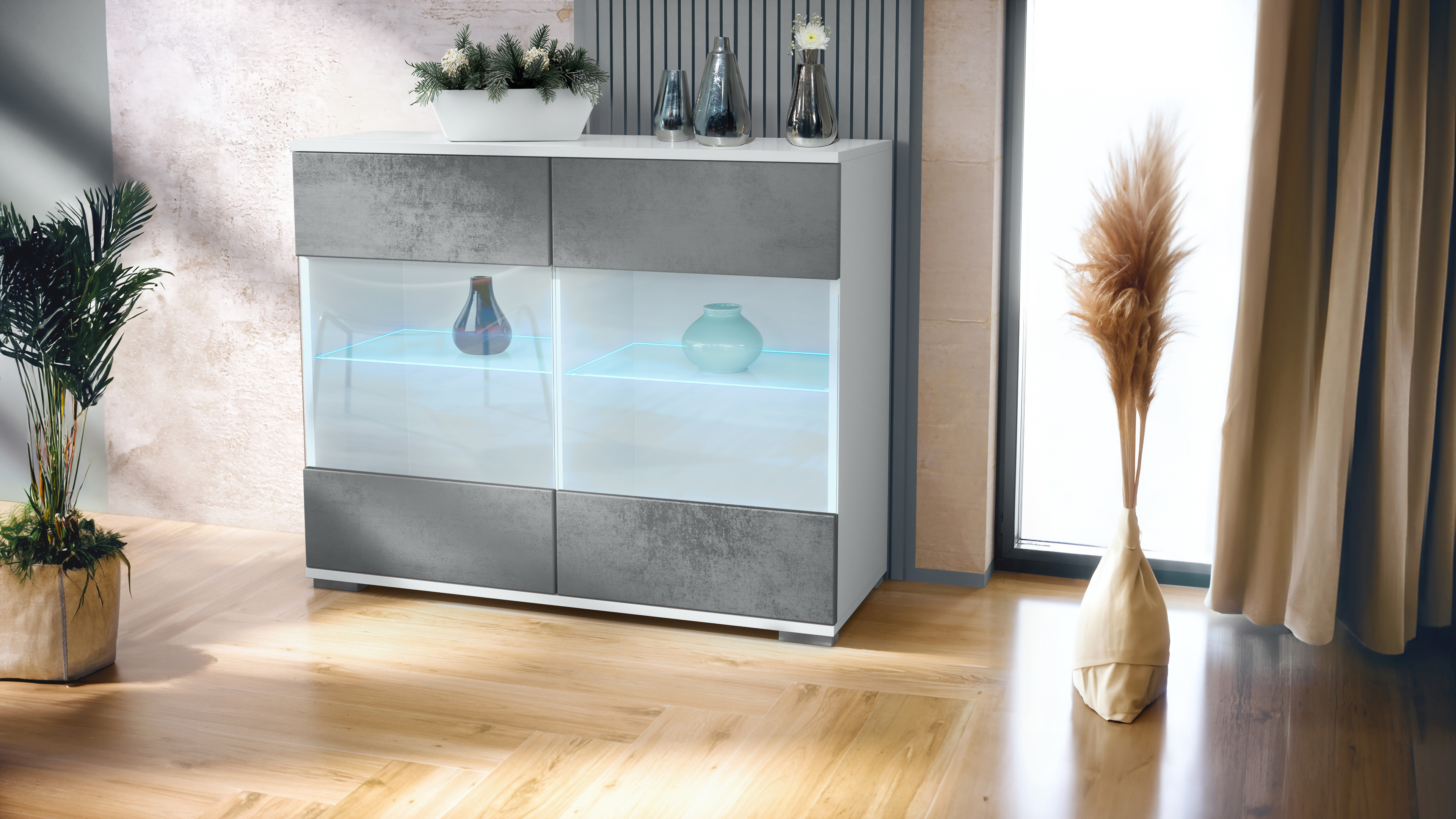 Produktinformationen "Bari V3 Kommode Weiß + LED mit 2 großen Glastüren inkl. RGB Beleuchtung Weiß matt / Beton Dunkel Optik (92,5 x 75.5 x 35)"