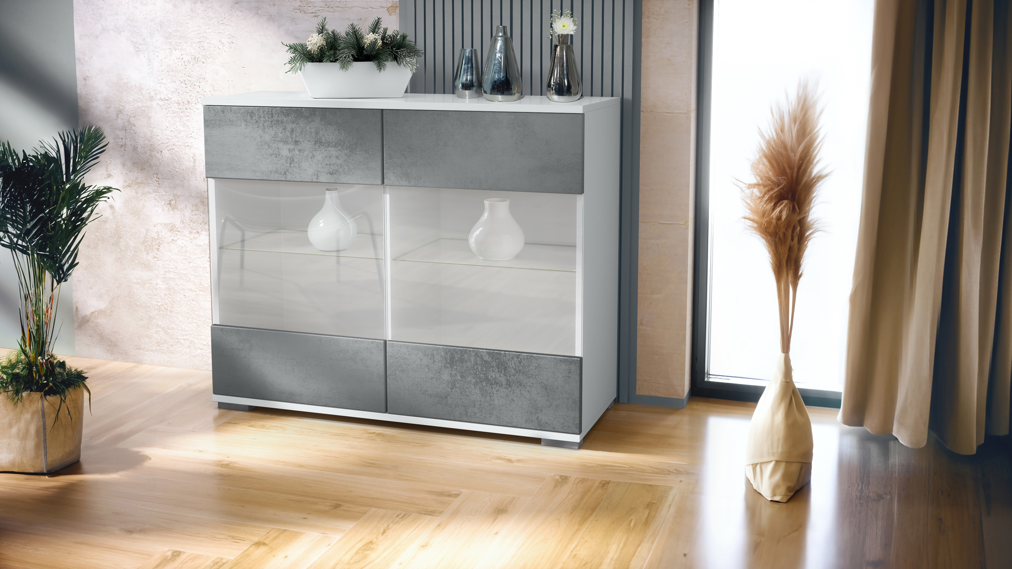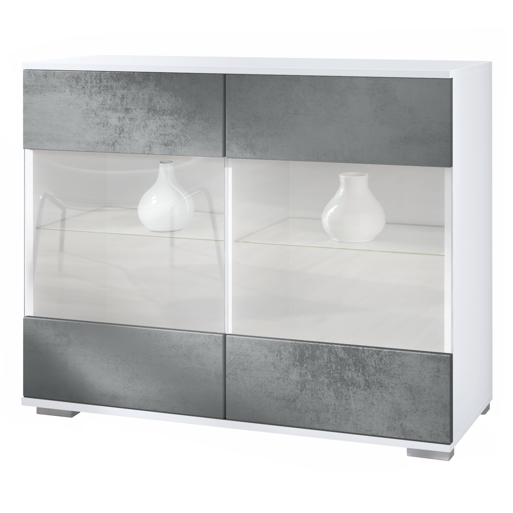 Produktinformationen "Bari V3 Kommode Weiß mit 2 großen Glastüren Weiß matt / Beton Dunkel Optik (92,5 x 75.5 x 35)"
