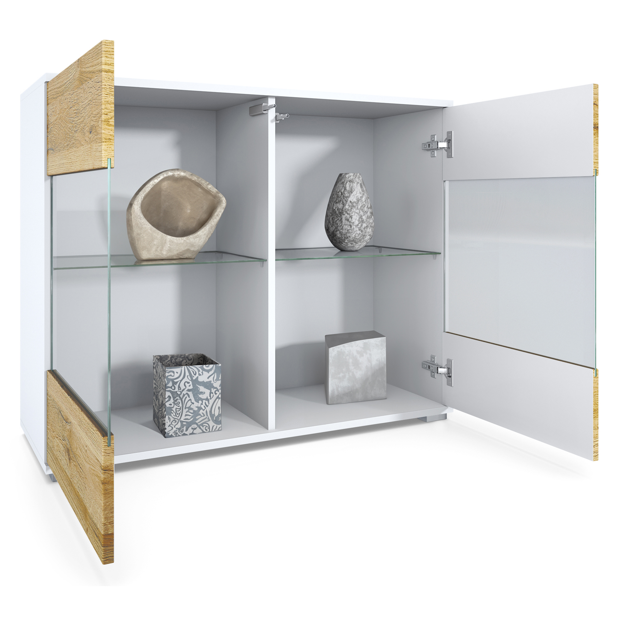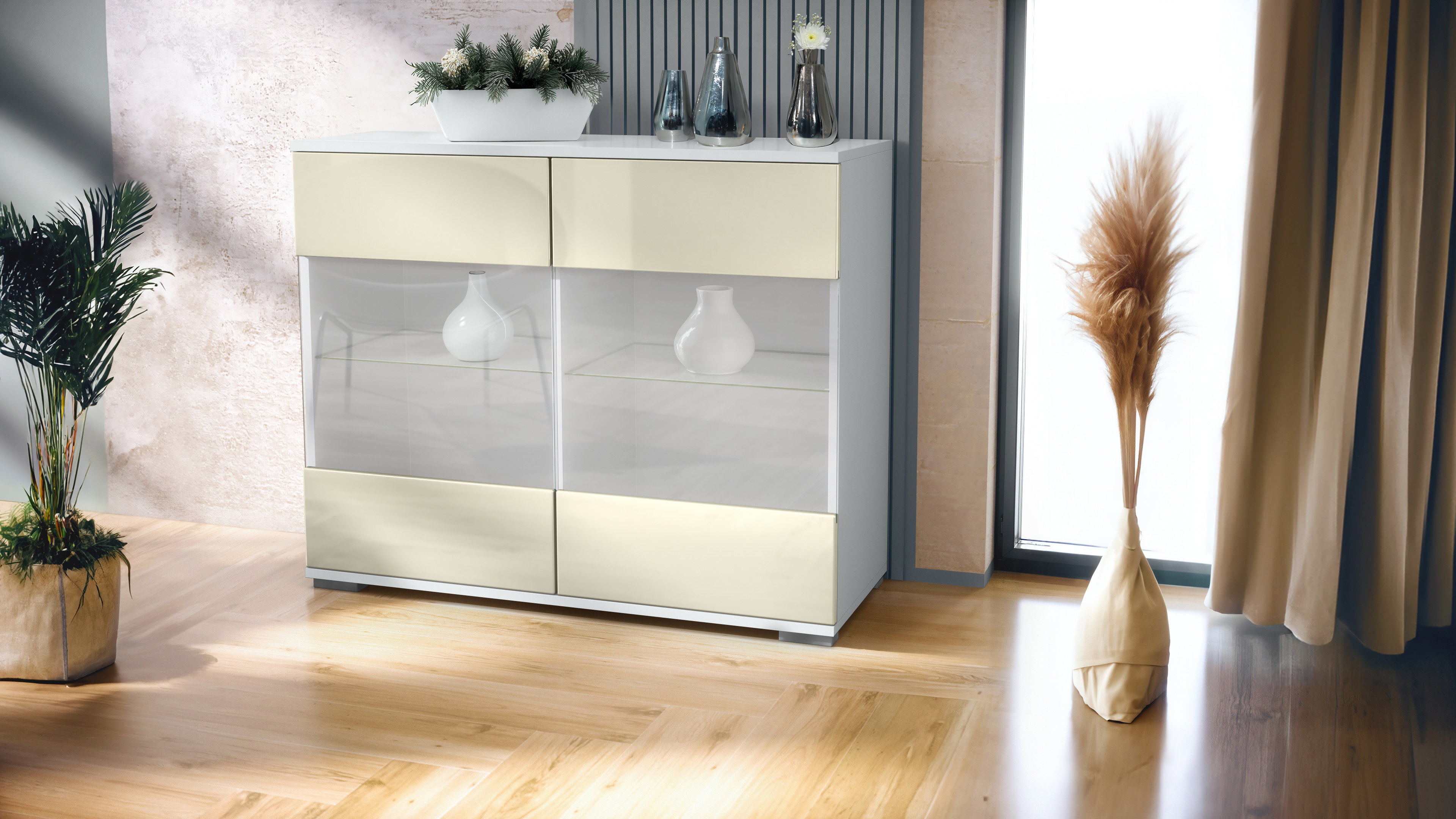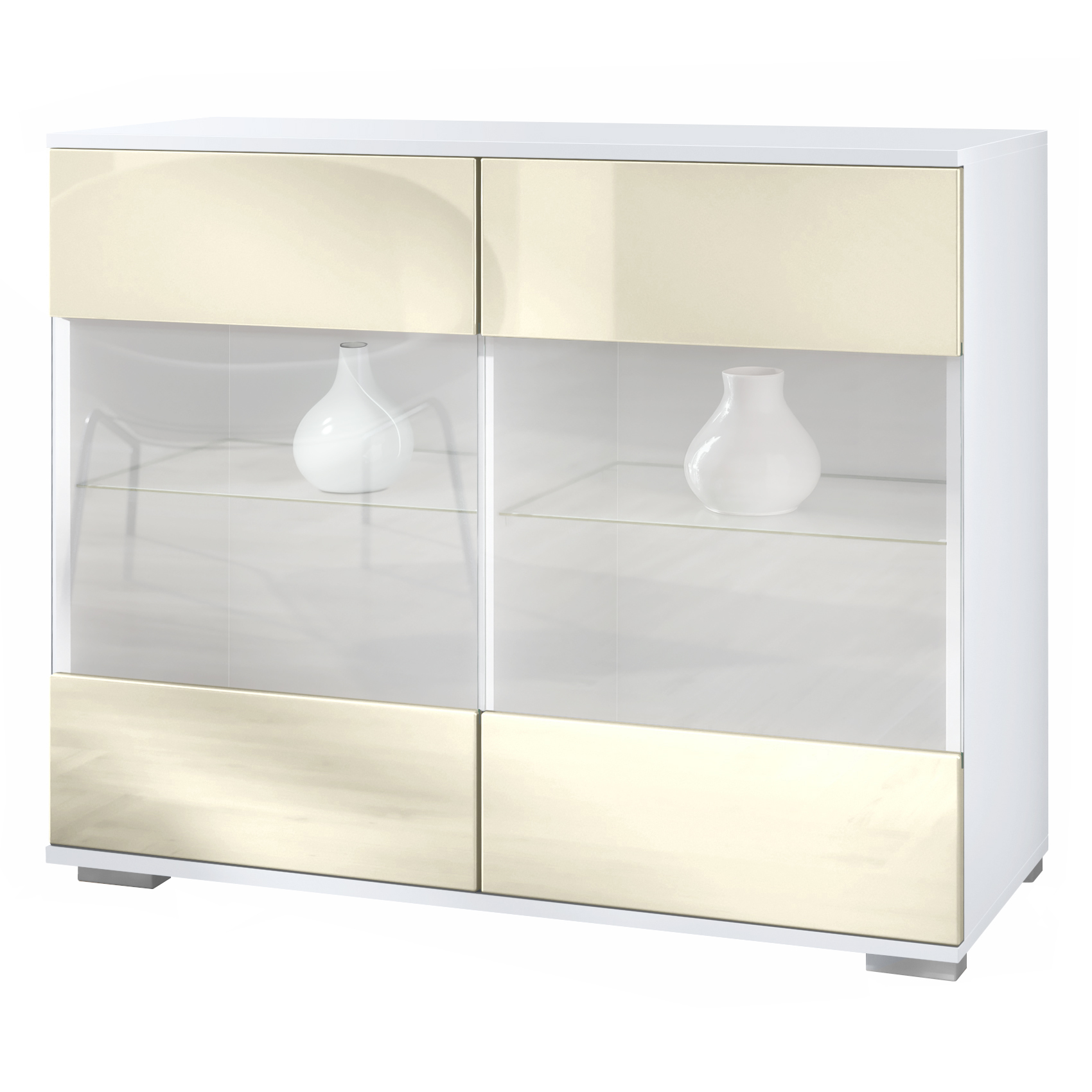 Produktinformationen "Bari V3 Kommode Weiß mit 2 großen Glastüren Weiß matt / Creme Hochglanz (92,5 x 75.5 x 35)"