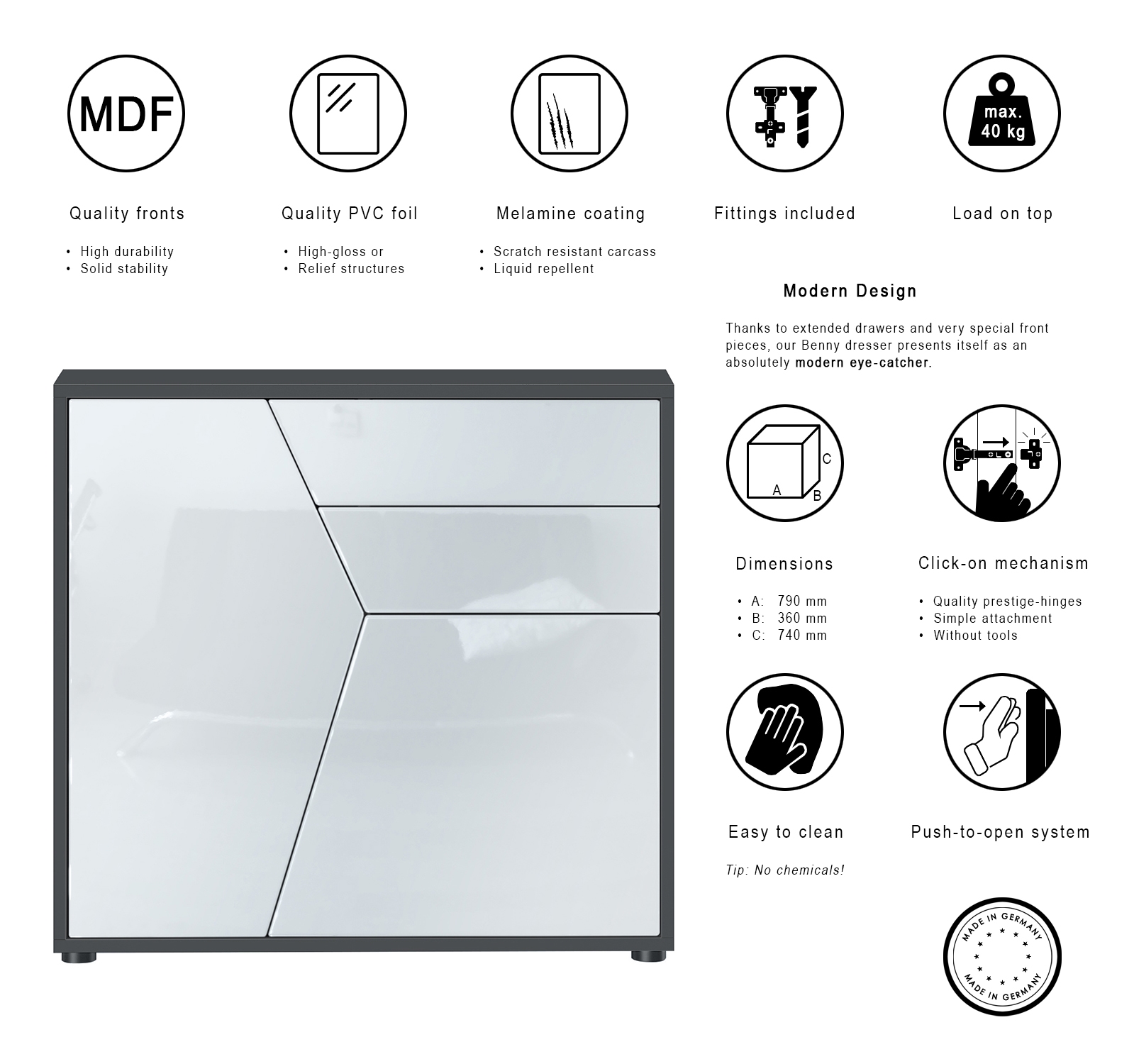 Ob als modernes Sideboard im Wohnzimmer, Kommodenschrank für's Schlafzimmer, Anrichte im Flur oder als Kommode im Kinderzimmer - die geräumige Kommode Benny präsentiert sich als praktisches Möbelstück mit modernem Design, hergestellt in Deutschland. Der Beistellschrank ist mit einer großen Tür, einer kleinen Tür und zwei leichtgängigen Schubladen ausgerüstet. Die Schubkästen verlaufen dank Laufschienen aus Metall nahezu geräuschlos und sorgen für eine leichte Handhabung. Hinter den Türen befinden sich jeweils zwei geräumige Fächer mit Einlegeboden. Die Türen und Schubladen sind mit unserem Push-to-Open-System ausgestattet. Eine Rückwand in Holzoptik aus Hartfaserplatten ist im Lieferumfang enthalten.