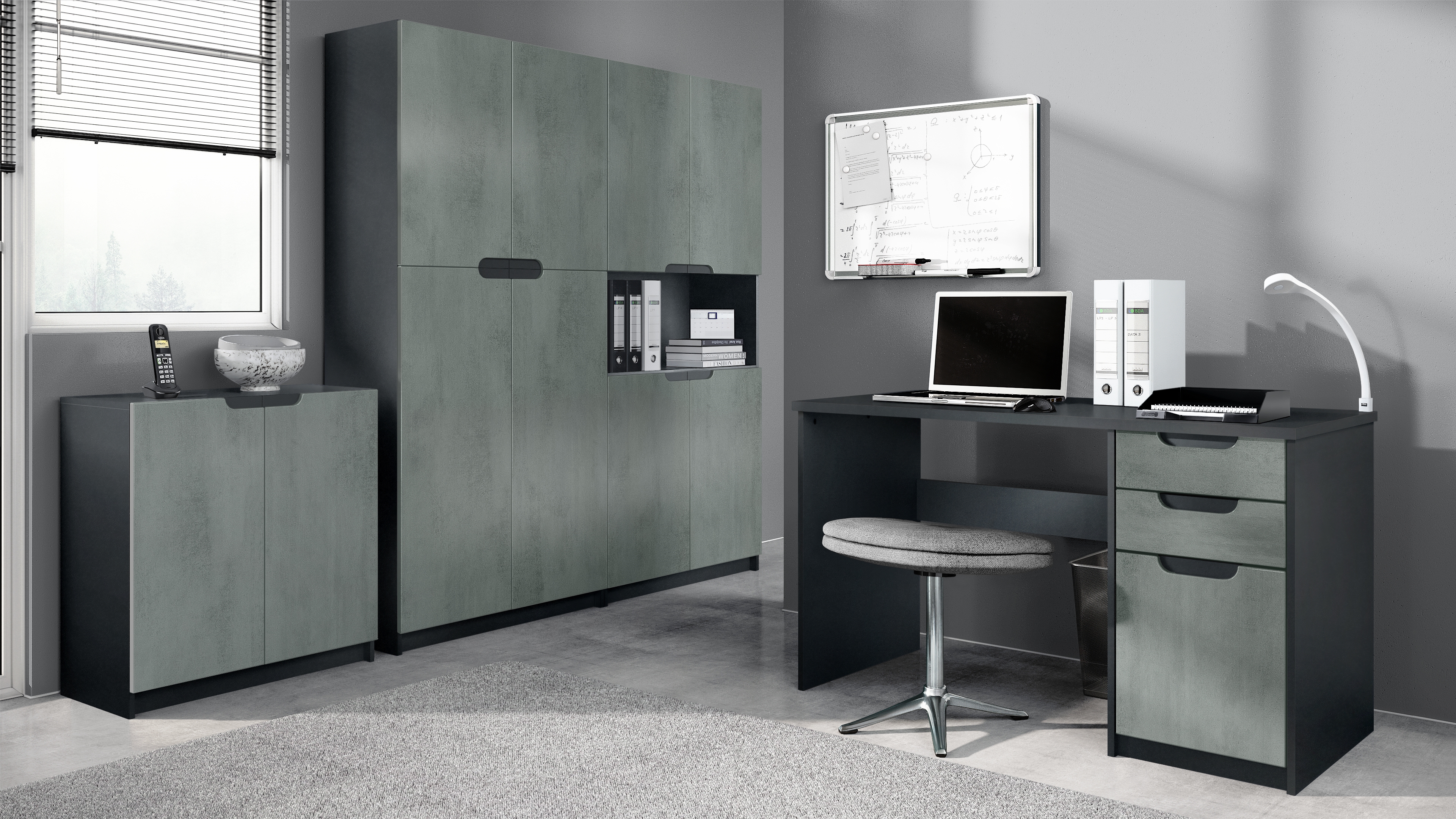 Dieses Büromöbel-Set beinhaltet einen Schreibtisch mit 2 Schubkästen und einer Tür, einen geschlossenen Schrank mit 4 Türen, einen Schrank mit 4 Türen und einem offenen Fach sowie eine Kommode mit 2 Türen.