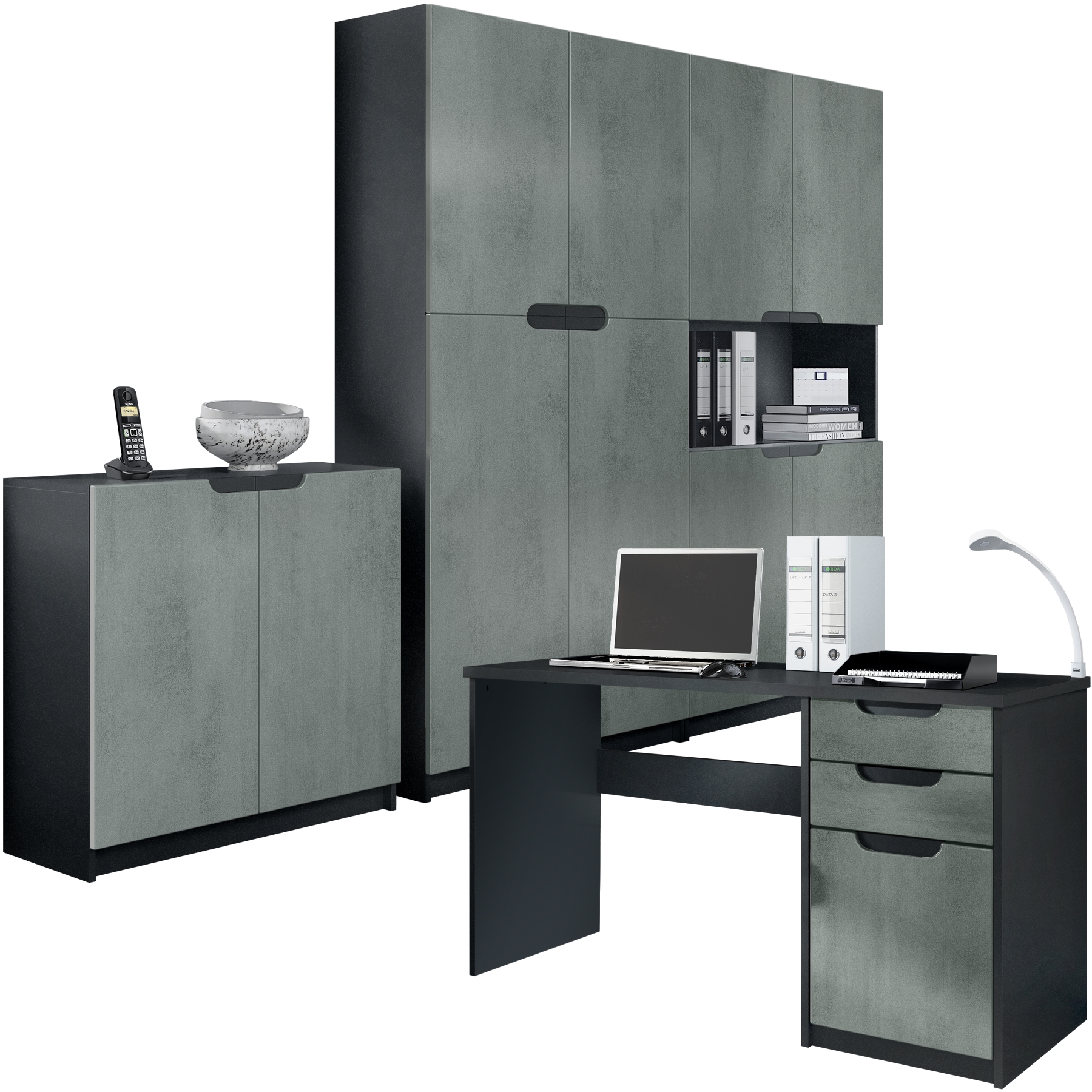 Produktinformationen "Büromöbel-Set Logan mit 1 Schreibtisch, 2 Schränken und 1 Kommode Schwarz matt/Beton dunkel Optik (246 x 60 x 185 cm)"