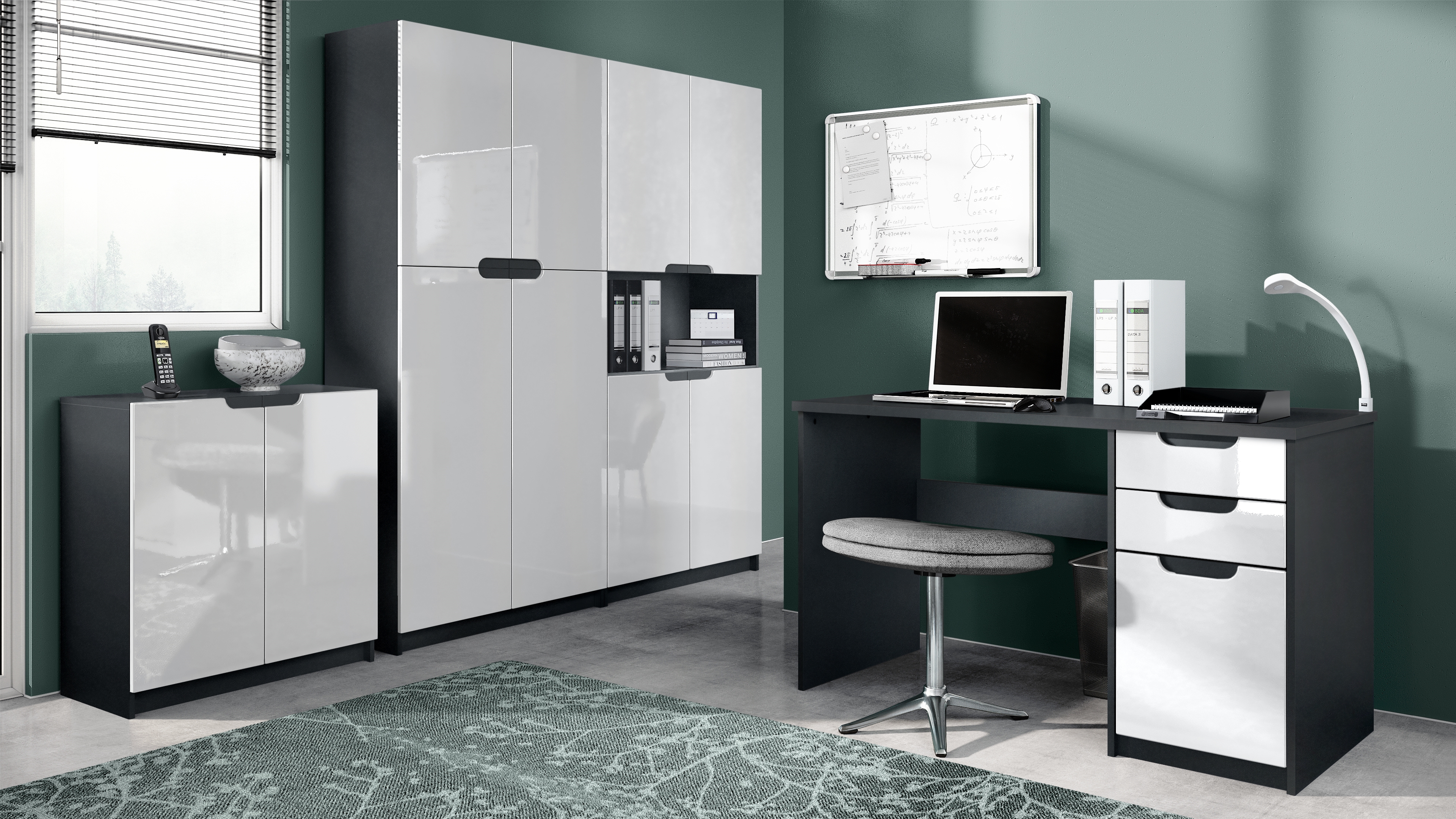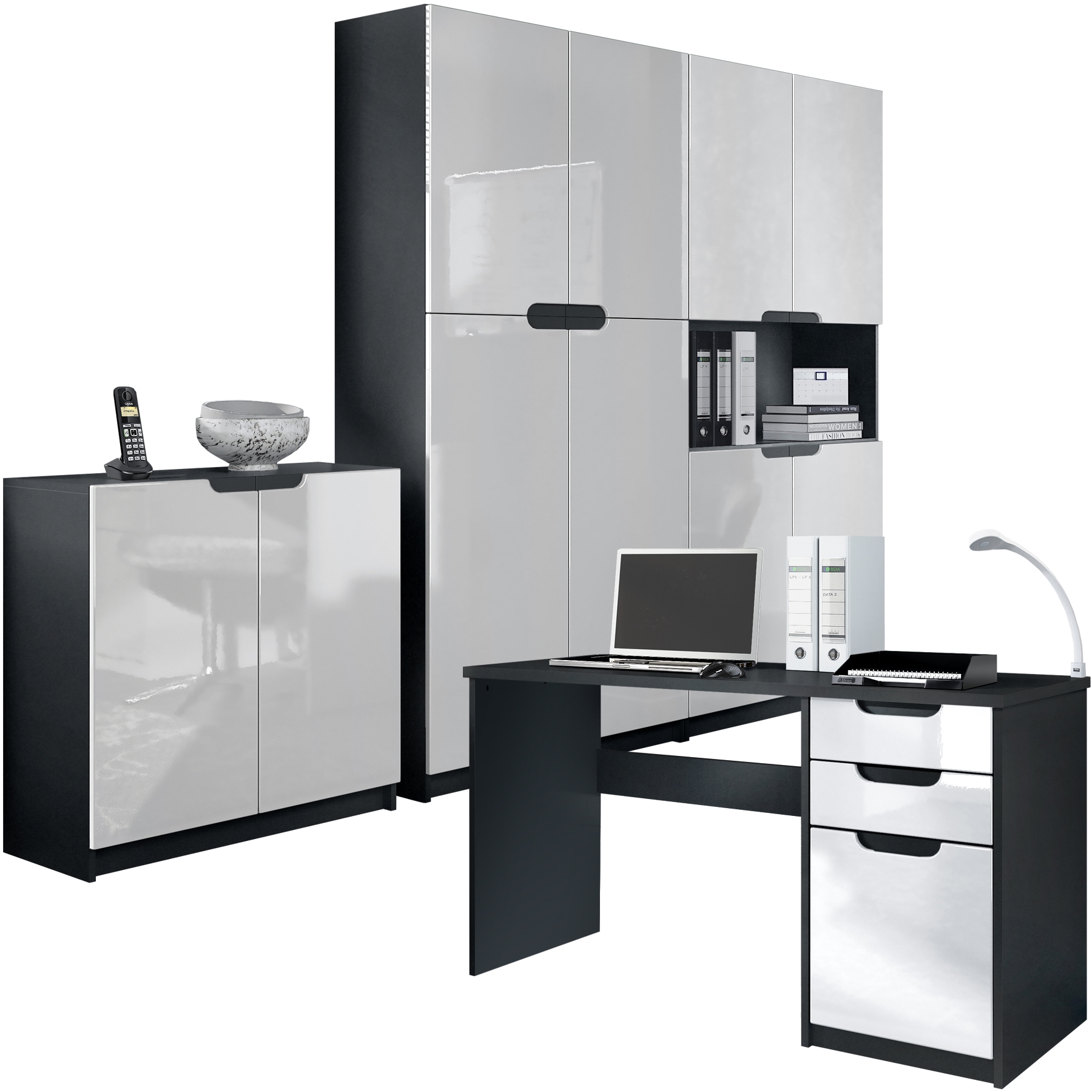 Produktinformationen "Büromöbel-Set Logan mit 1 Schreibtisch, 2 Schränken und 1 Kommode Schwarz matt/Weiß Hochglanz (246 x 60 x 185 cm)"