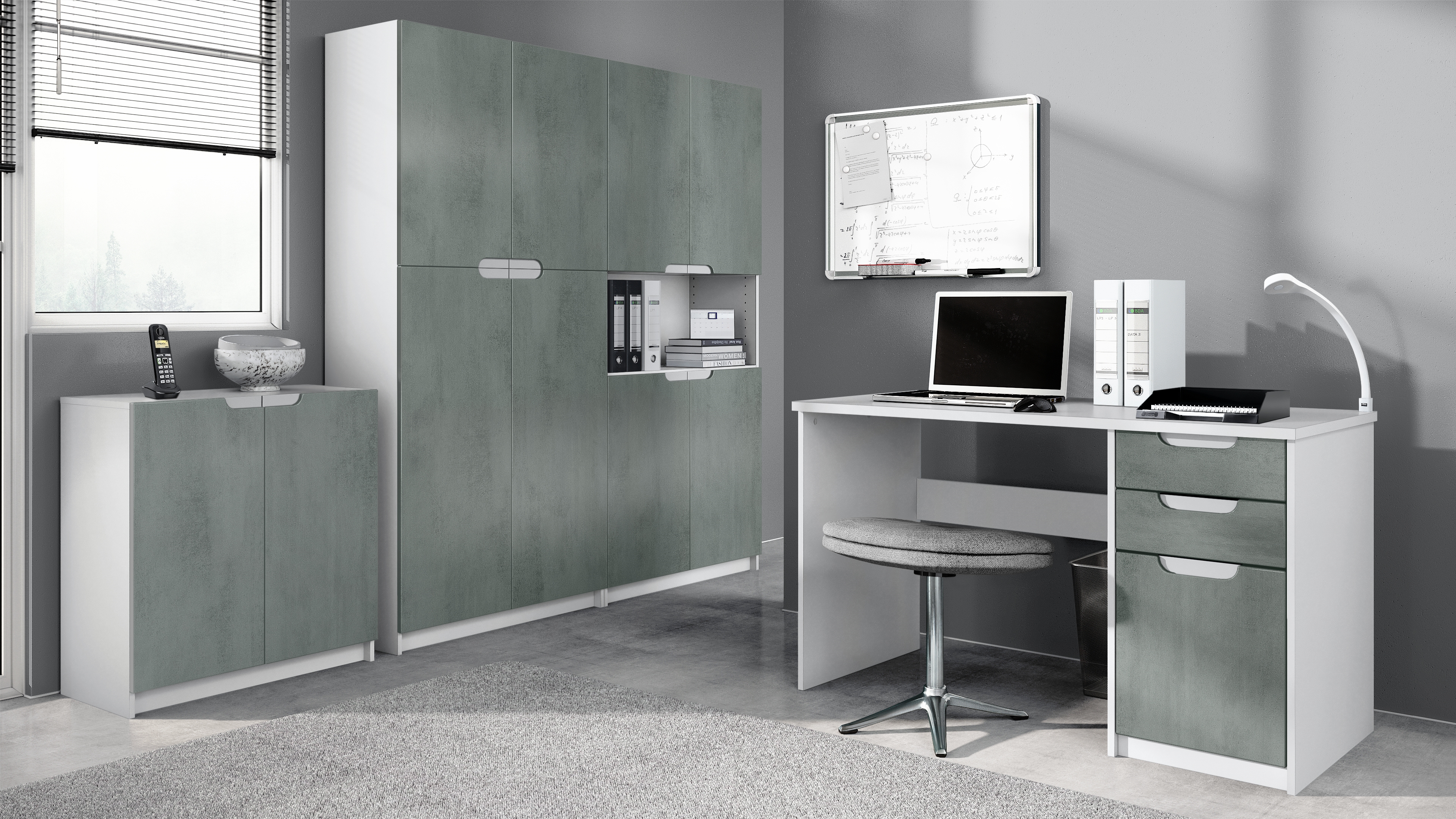 Dieses Büromöbel-Set beinhaltet einen Schreibtisch mit 2 Schubkästen und einer Tür, einen geschlossenen Schrank mit 4 Türen, einen Schrank mit 4 Türen und einem offenen Fach sowie eine Kommode mit 2 Türen.