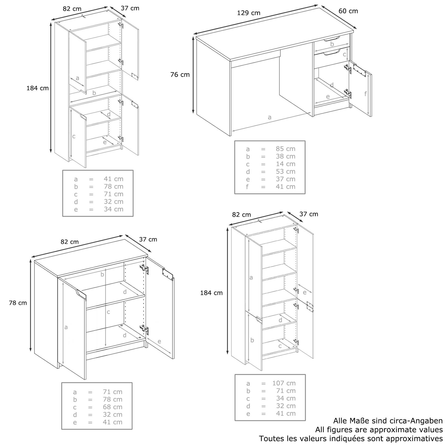 Die Maße in cm (BxHxT) sind wie folgt: 82 x 78 x 37 für die Kommode, 82 x 185 x 37 für die großen Schränke und 129 x 76 x 60 für den Schreibtisch.