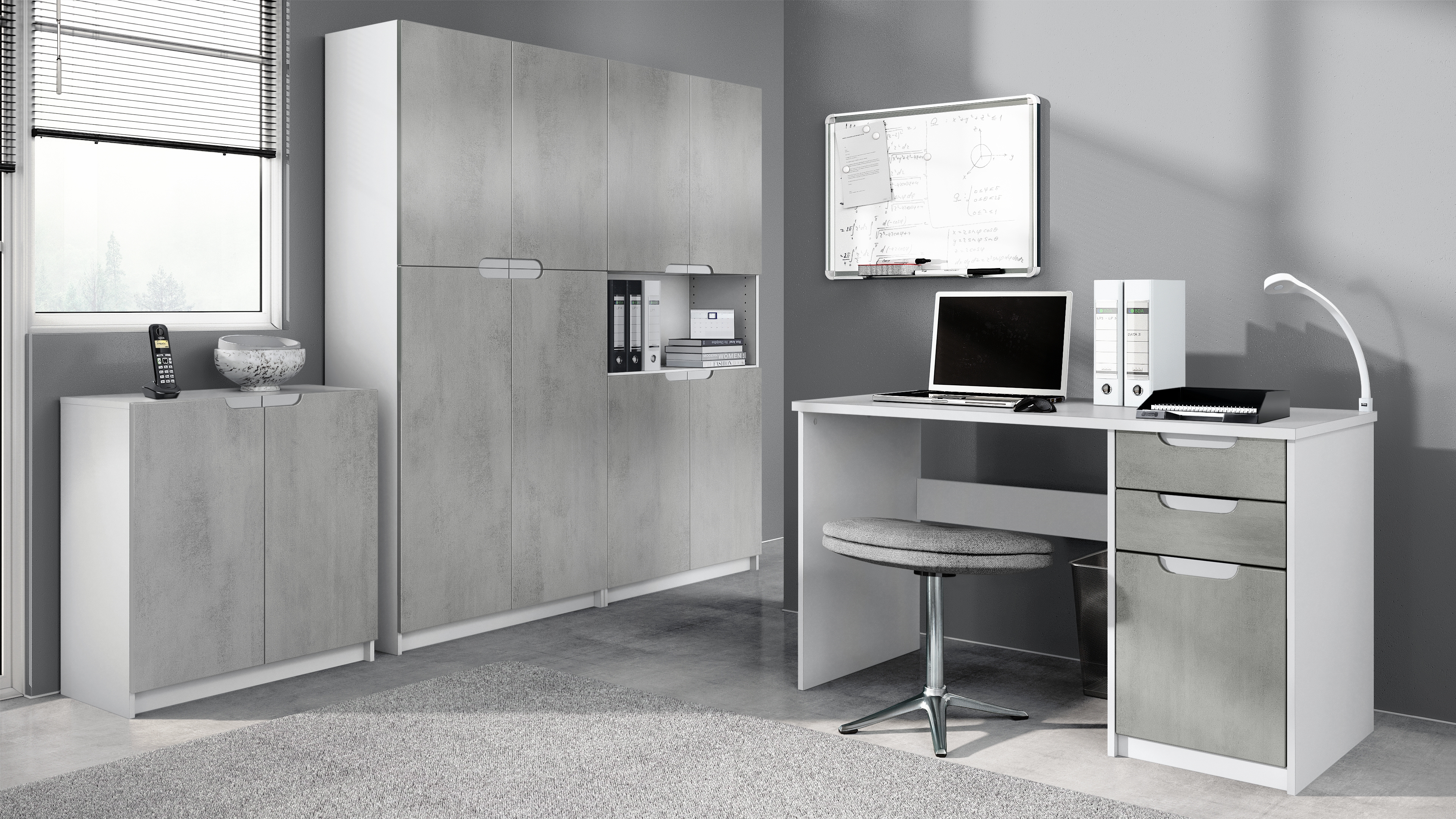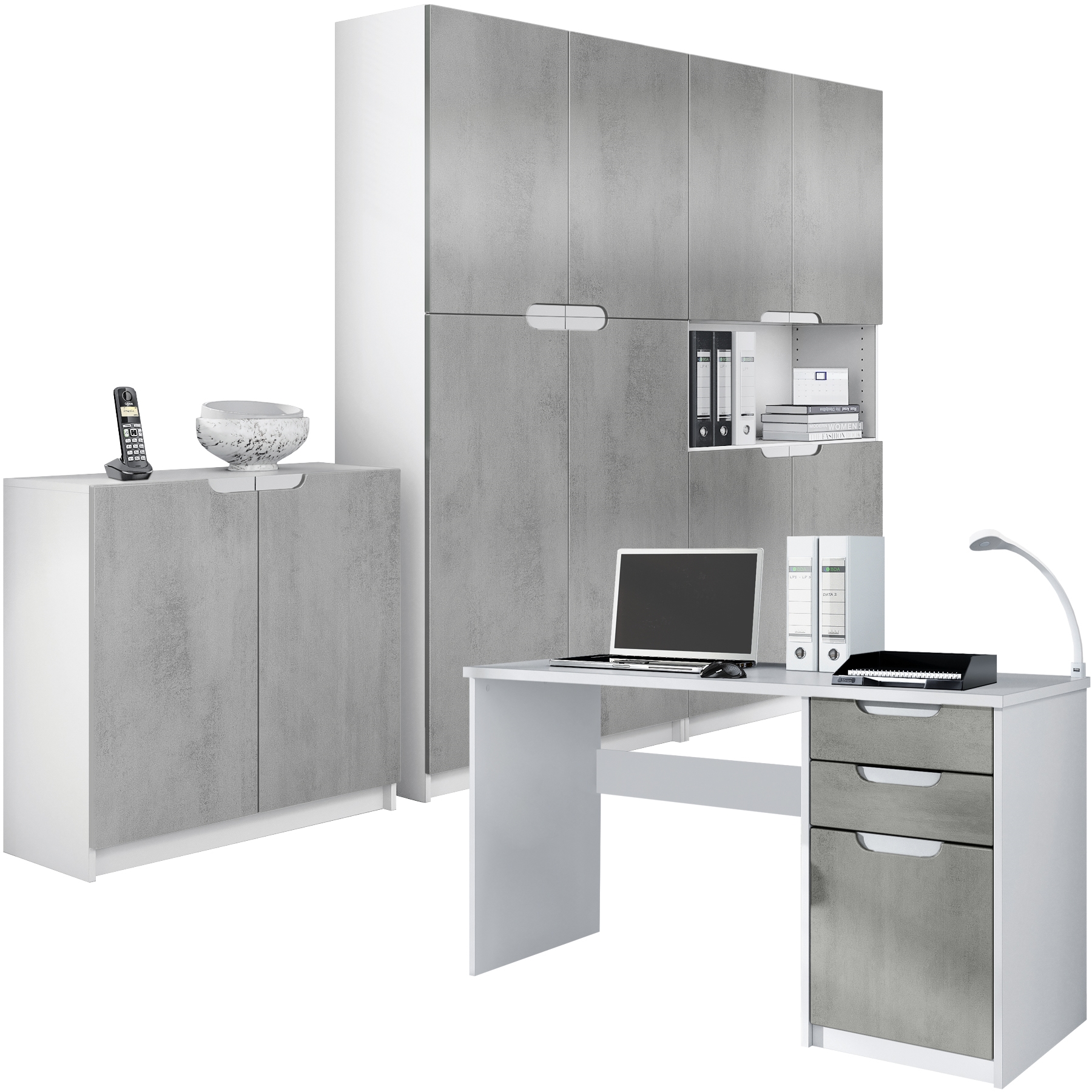 Produktinformationen "Büromöbel-Set Logan mit 1 Schreibtisch, 2 Schränken und 1 Kommode Weiß matt/Beton Oxid Optik (246 x 60 x 185 cm)"