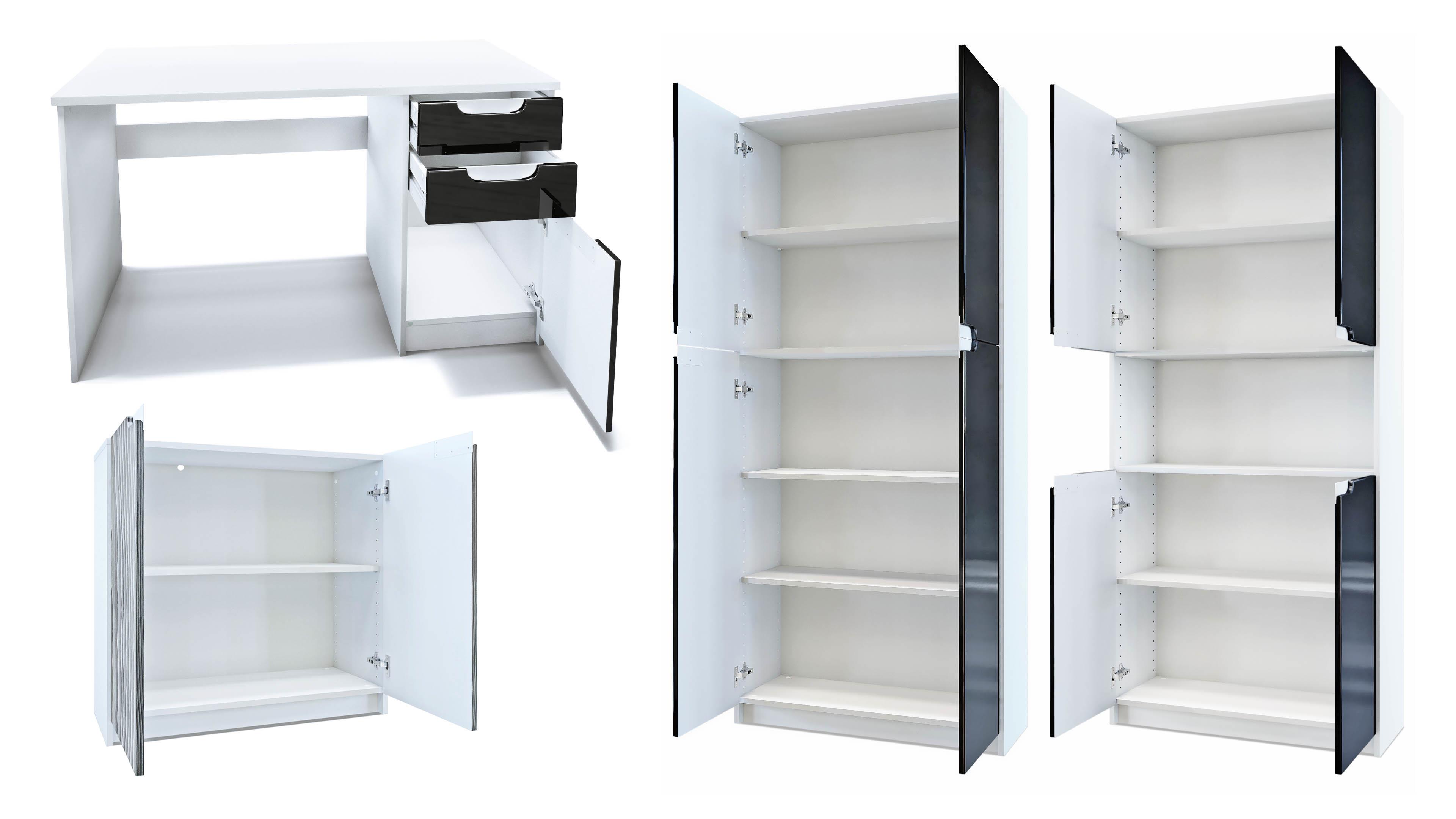 Dieses Büromöbel-Set beinhaltet einen Schreibtisch mit 2 Schubkästen und einer Tür, einen geschlossenen Schrank mit 4 Türen, einen Schrank mit 4 Türen und einem offenen Fach sowie eine Kommode mit 2 Türen.