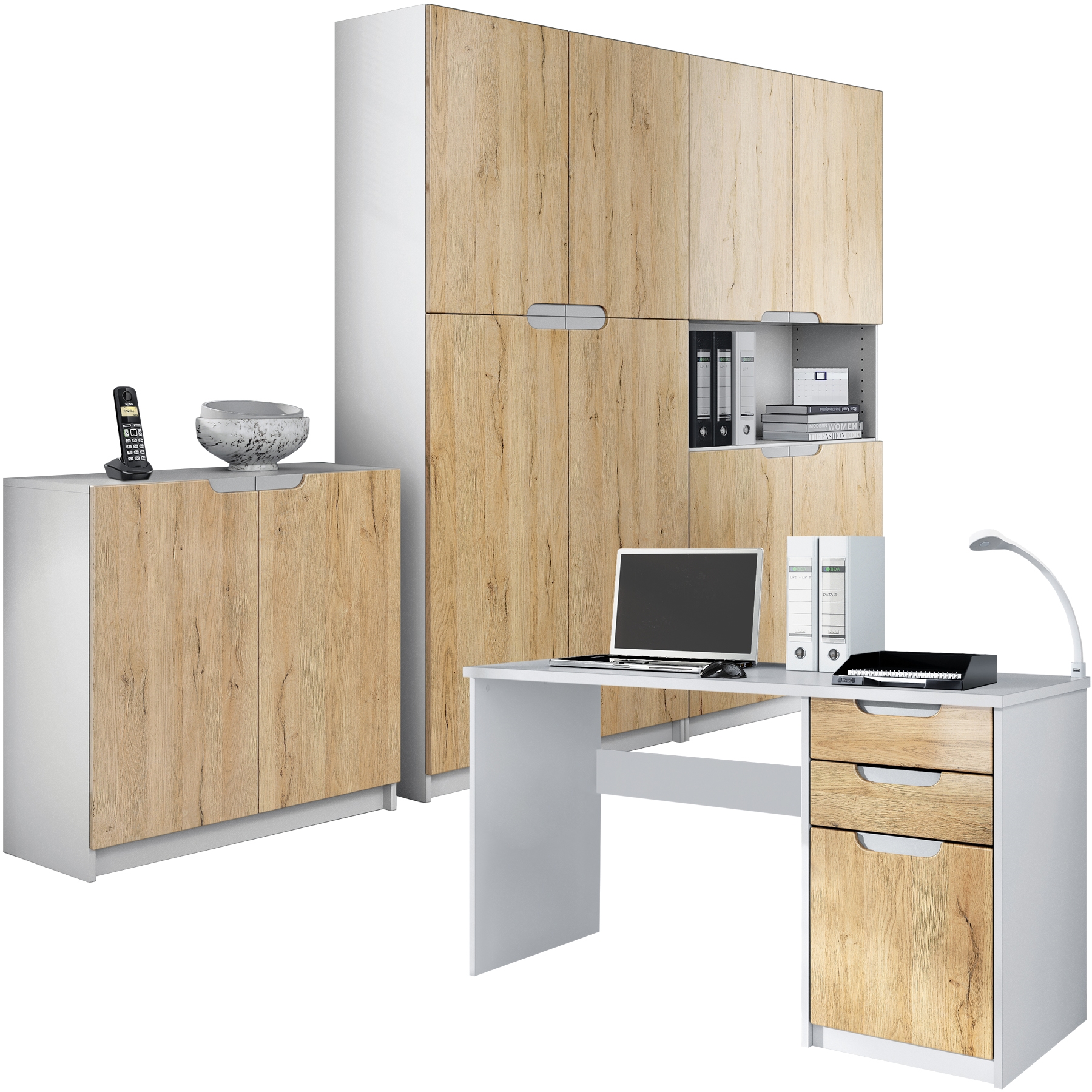 Produktinformationen "Büromöbel-Set Logan mit 1 Schreibtisch, 2 Schränken und 1 Kommode Weiß matt/Eiche Natur (246 x 60 x 185 cm)"