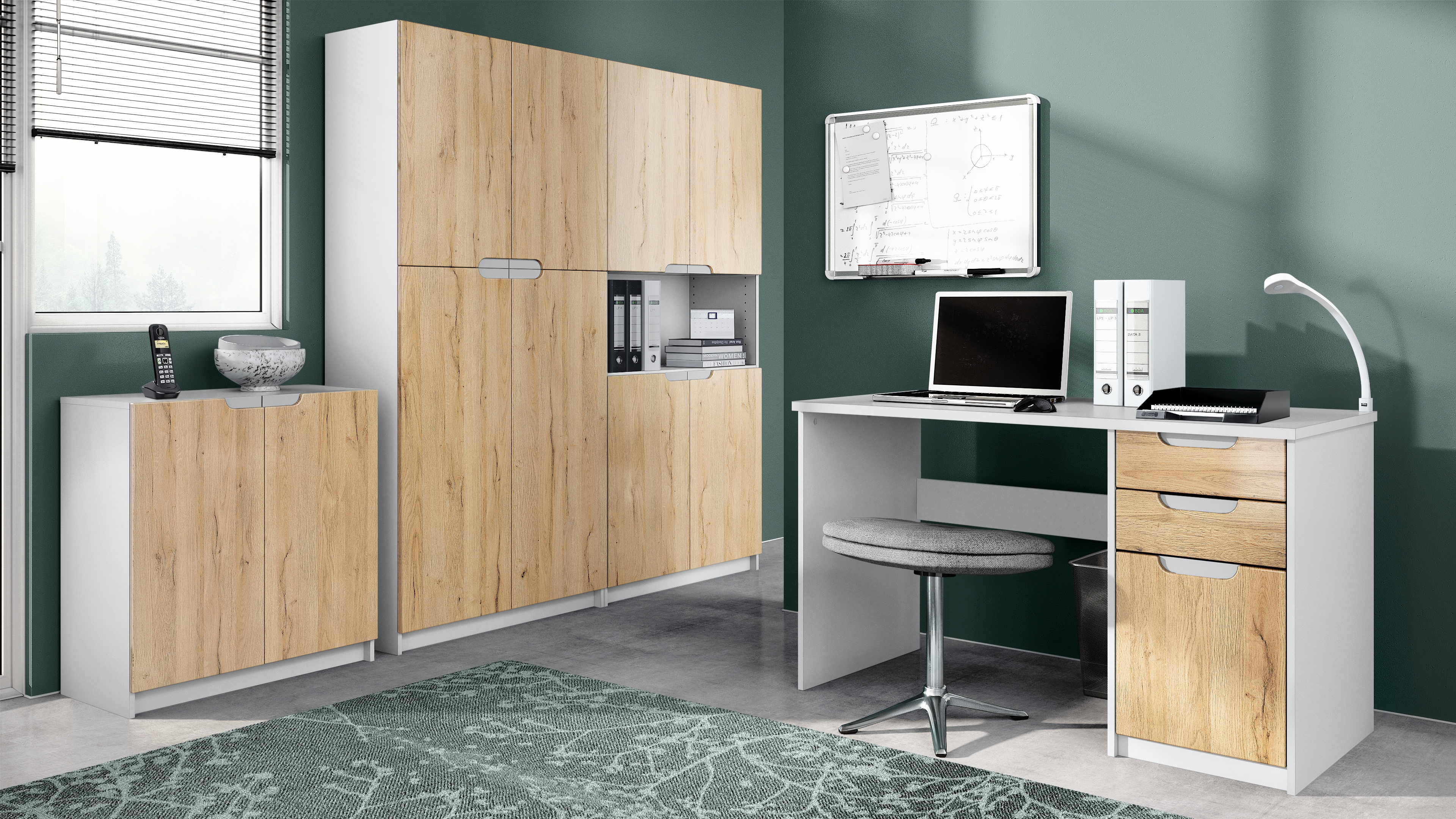 Dieses Büromöbel-Set beinhaltet einen Schreibtisch mit 2 Schubkästen und einer Tür, einen geschlossenen Schrank mit 4 Türen, einen Schrank mit 4 Türen und einem offenen Fach sowie eine Kommode mit 2 Türen.