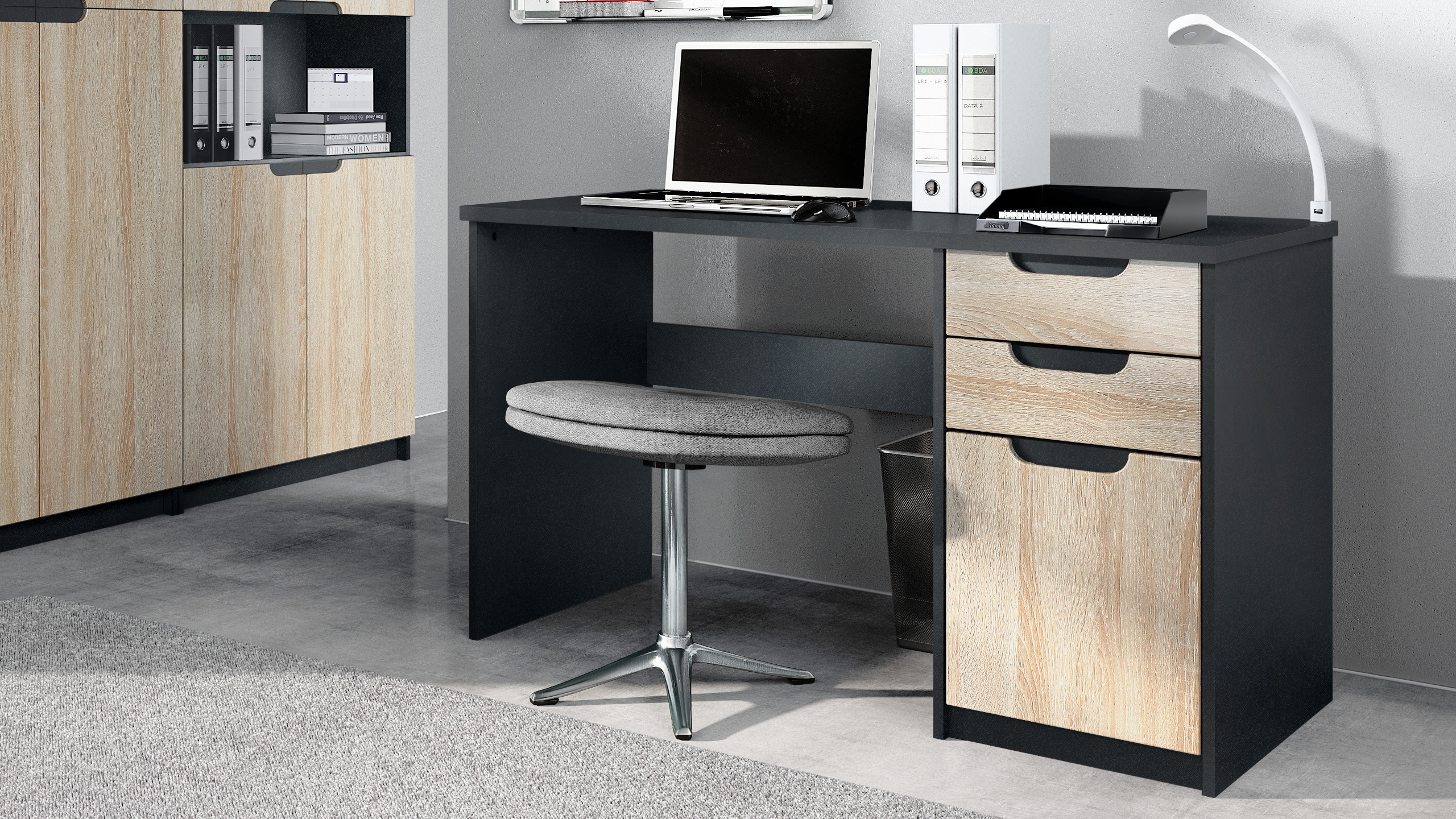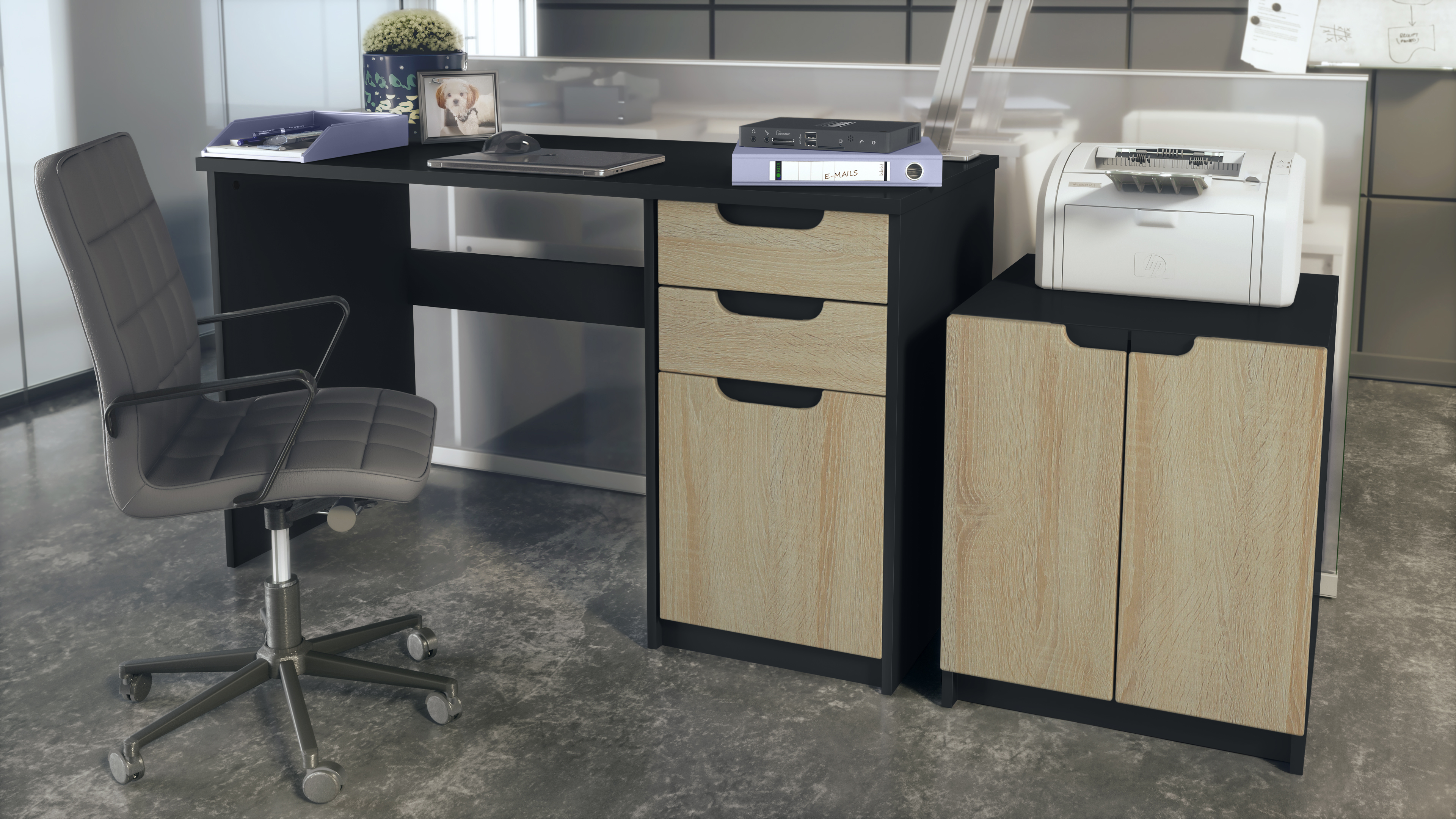 Produktinformationen "Büromöbel-Set Paris Schwarz mit 1 Schreibtisch und 1 Druckerkommode Schwarz matt / Eiche sägerau"