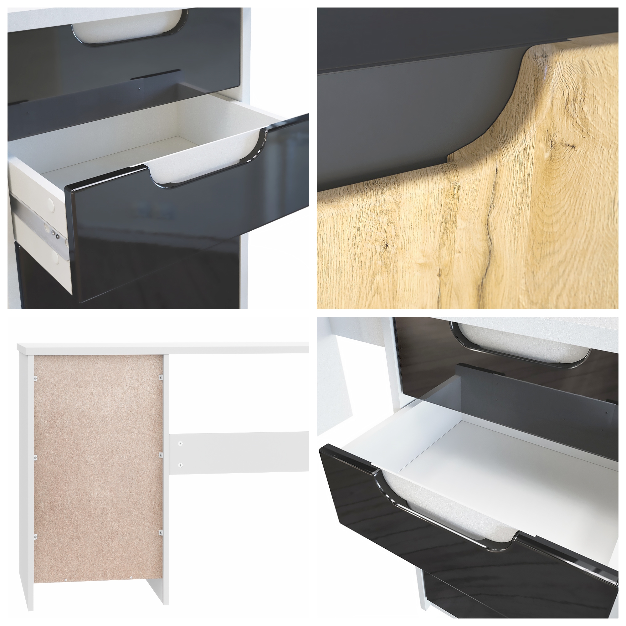 Die Türen sind mit Softclose-Scharnieren versehen, die ein leises Schließen gewährleisten. Die Möbel werden flach verpackt geliefert. Eine bebilderte Aufbauanleitung erleichtert die Selbstmontage.