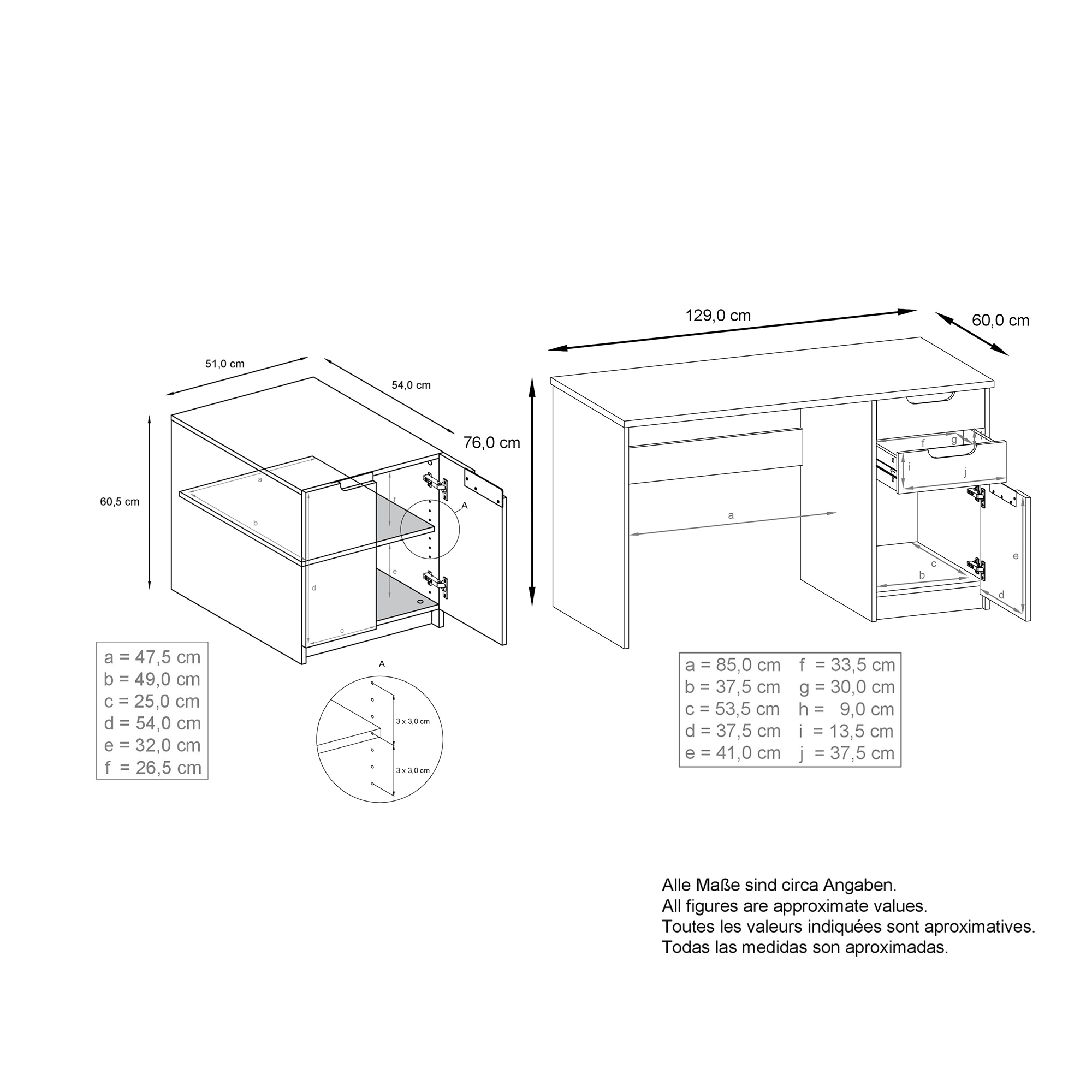Die Maße in cm (BxHxT) sind wie folgt: 51 x 60,5 x 54 für die Aktenkommode und 129 x 76 x 60 für den Bürotisch.