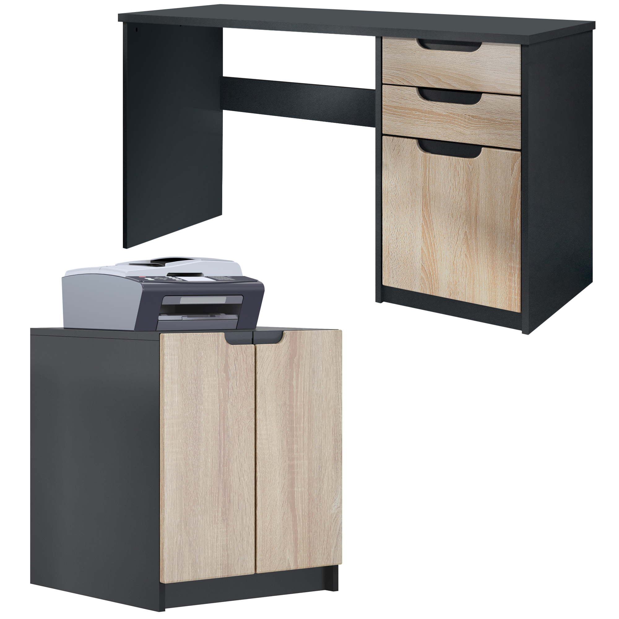 Dieses Büromöbel-Set beinhaltet einen Schreibtisch mit 2 Schubkästen und einer Tür, sowie eine Druckerkommode mit 2 Türen mit höhen verstellbaren Einlegeboden.