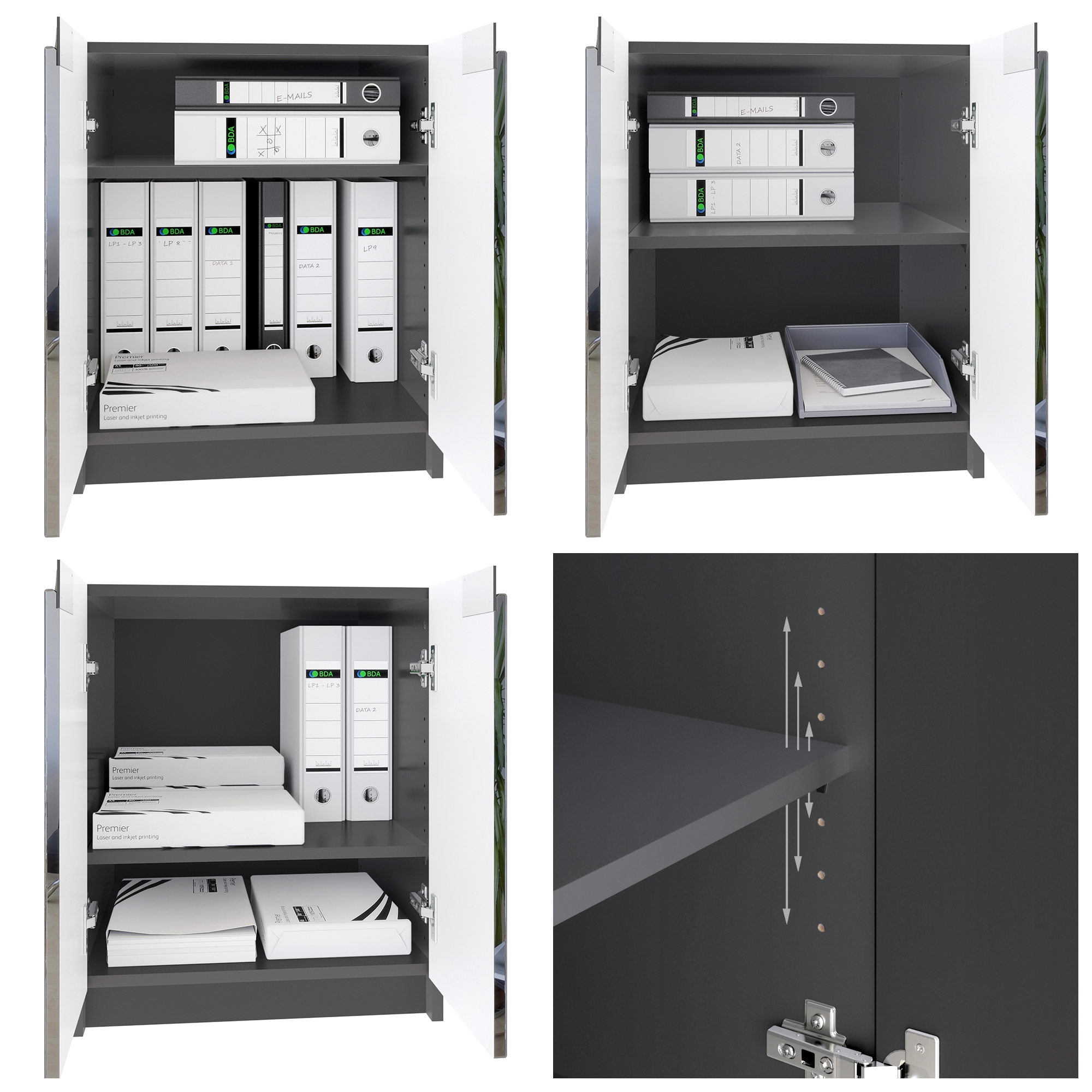 Hochwertige Designelemente wie eingelassene, optisch abgesetzte Griffmulden und flexibel wählbare Frontfarben verleihen Ihrer Büroeinrichtung Individualität und Stil.