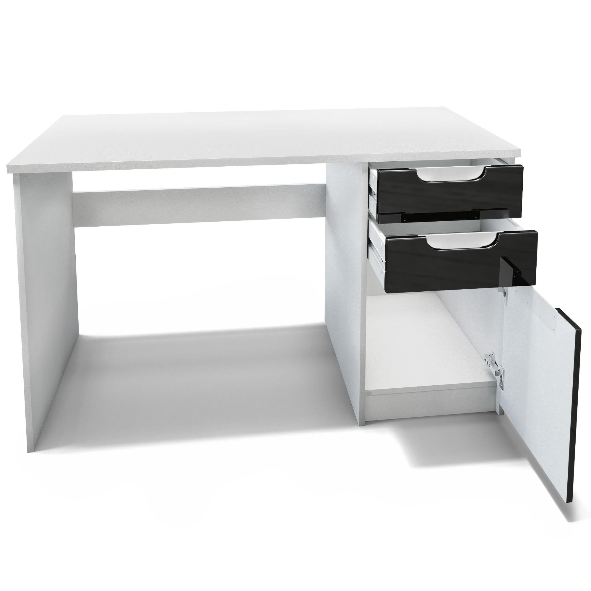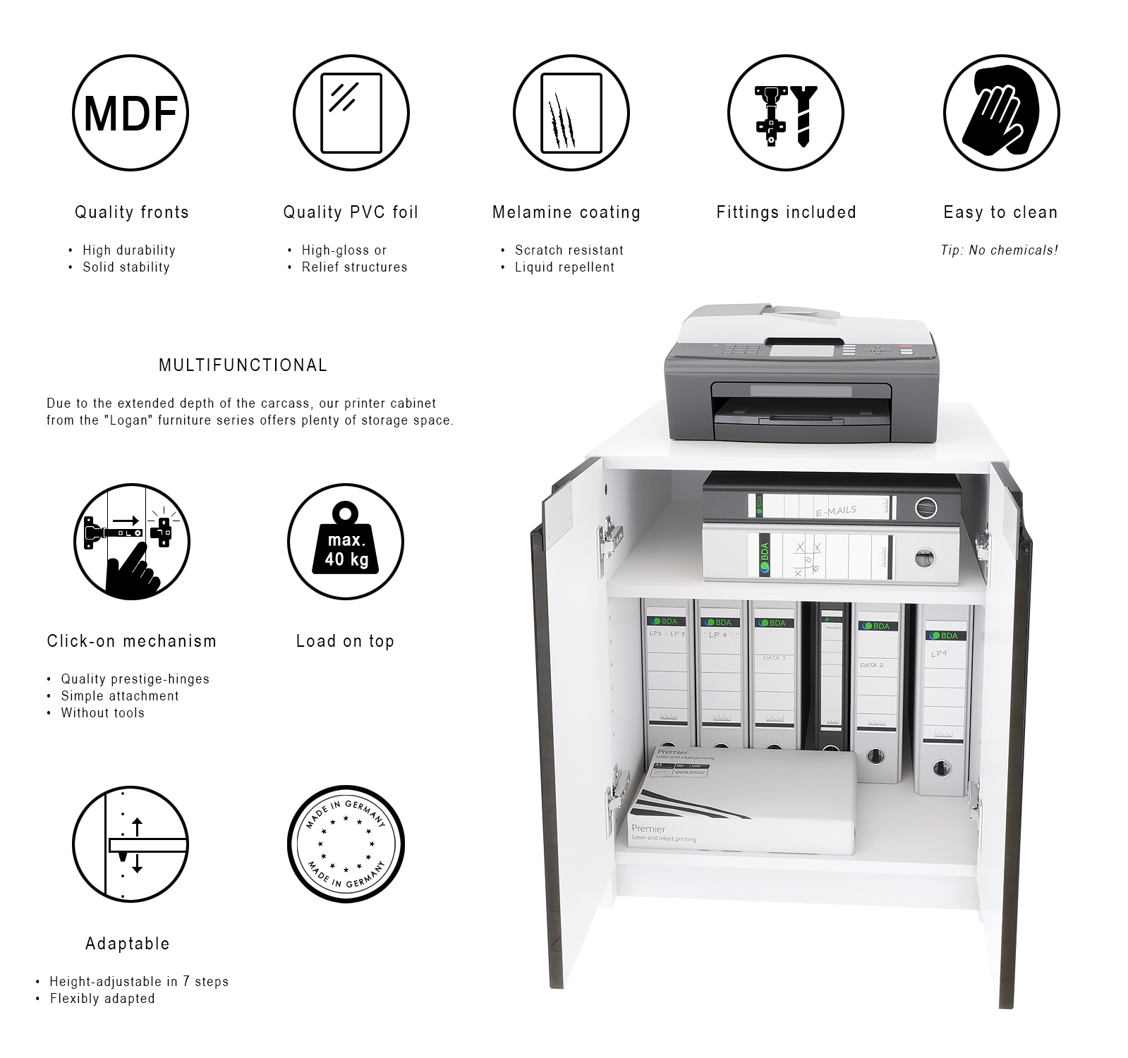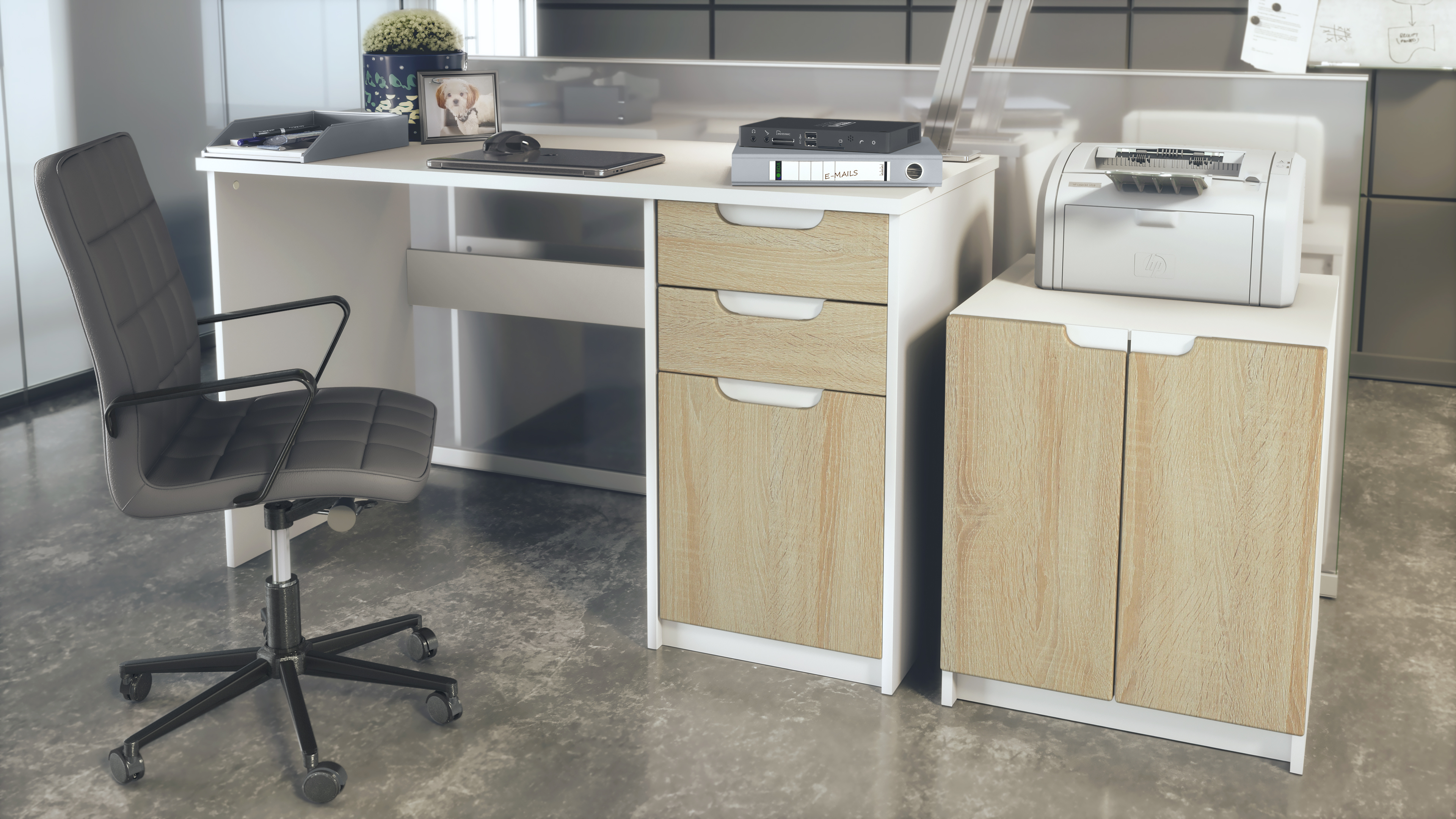 Dieses Büromöbel-Set beinhaltet einen Schreibtisch mit 2 Schubkästen und einer Tür, sowie eine Druckerkommode mit 2 Türen mit höhen verstellbaren Einlegeboden.