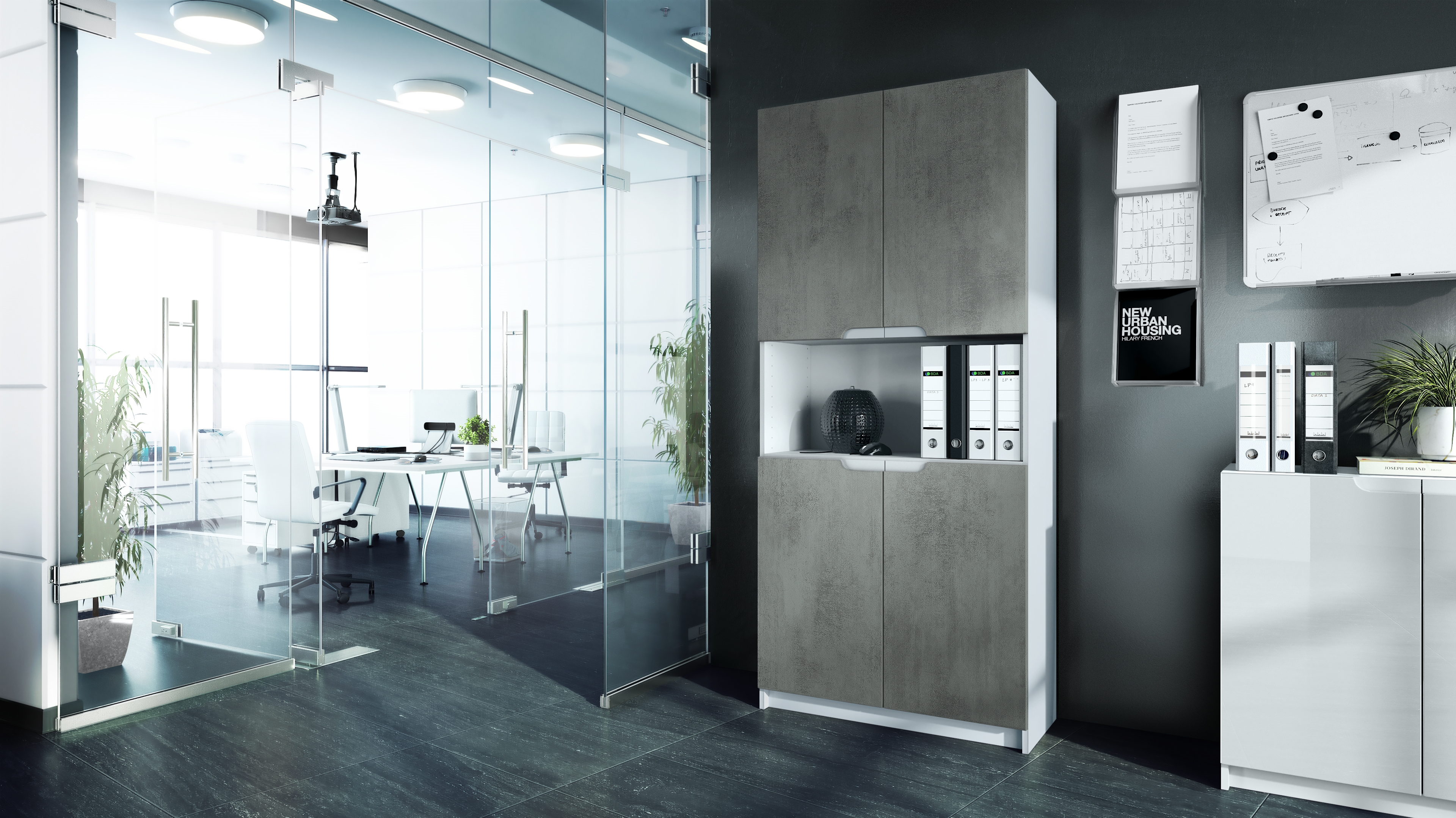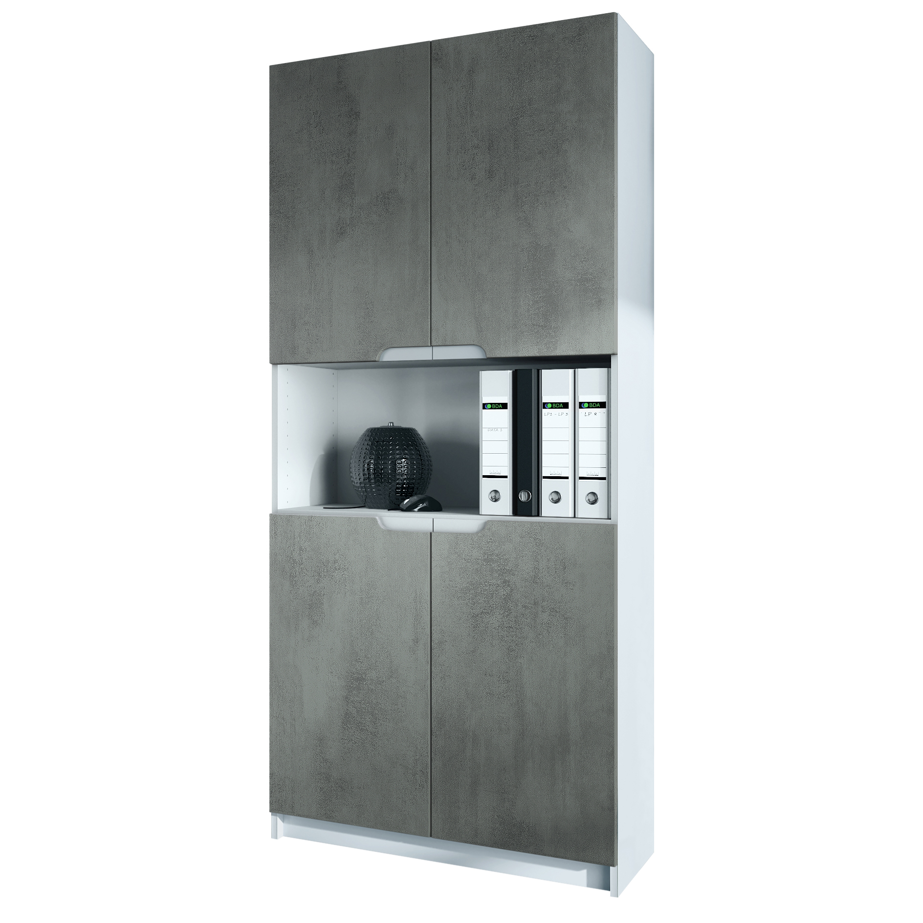 Produktinformationen "Büroschrank Logan V2 mit 5 Fächern und 4 Türen Weiß matt/Beton dunkel Optik (82 x 185 x 37 cm)"