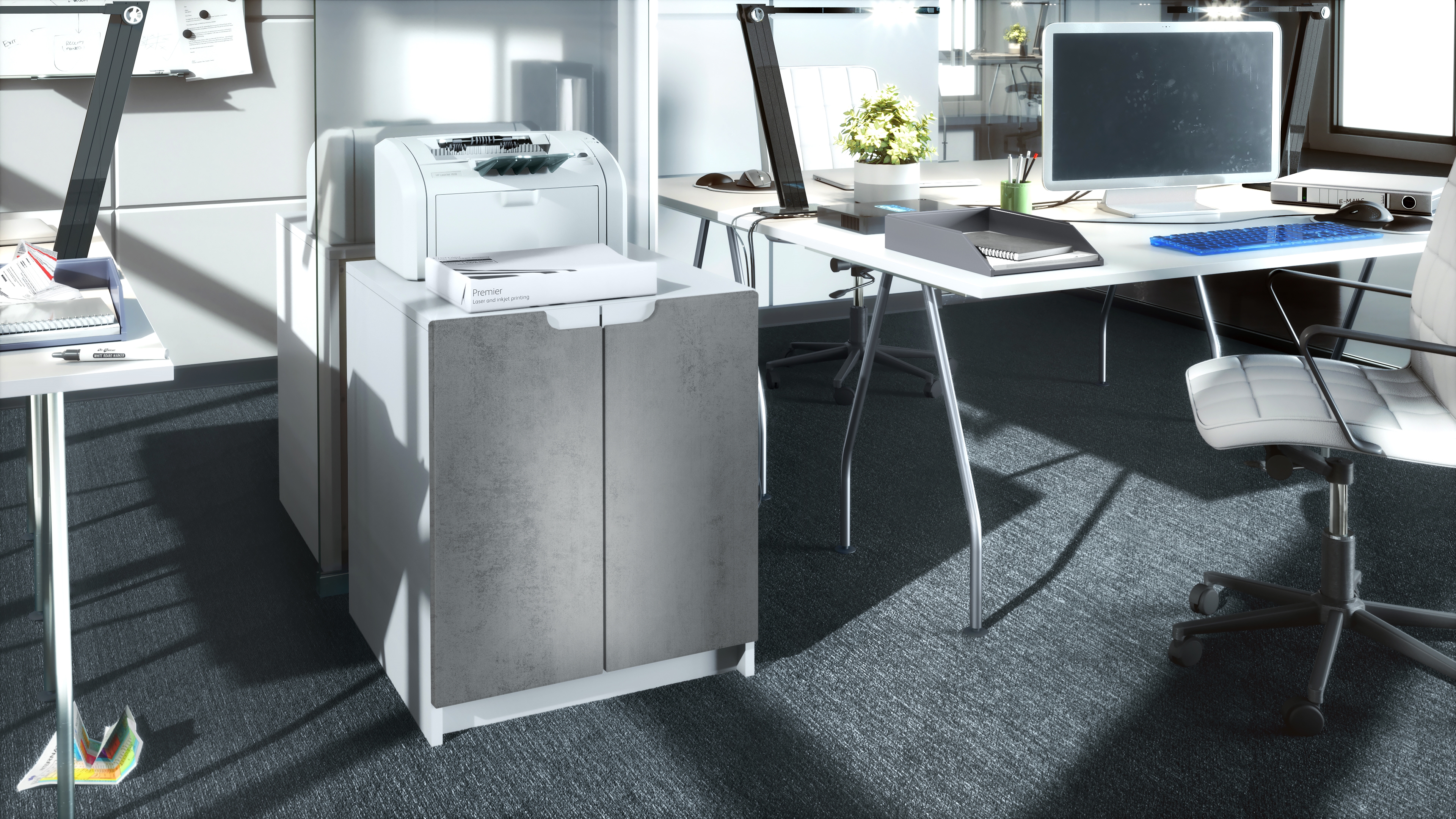 Produktinformationen "Druckerkommode Logan mit 2 Fächern und 2 Türen Druckerschrank Weiß matt/Beton Dunkel Optik (51 x 60,5 x 54 cm)"