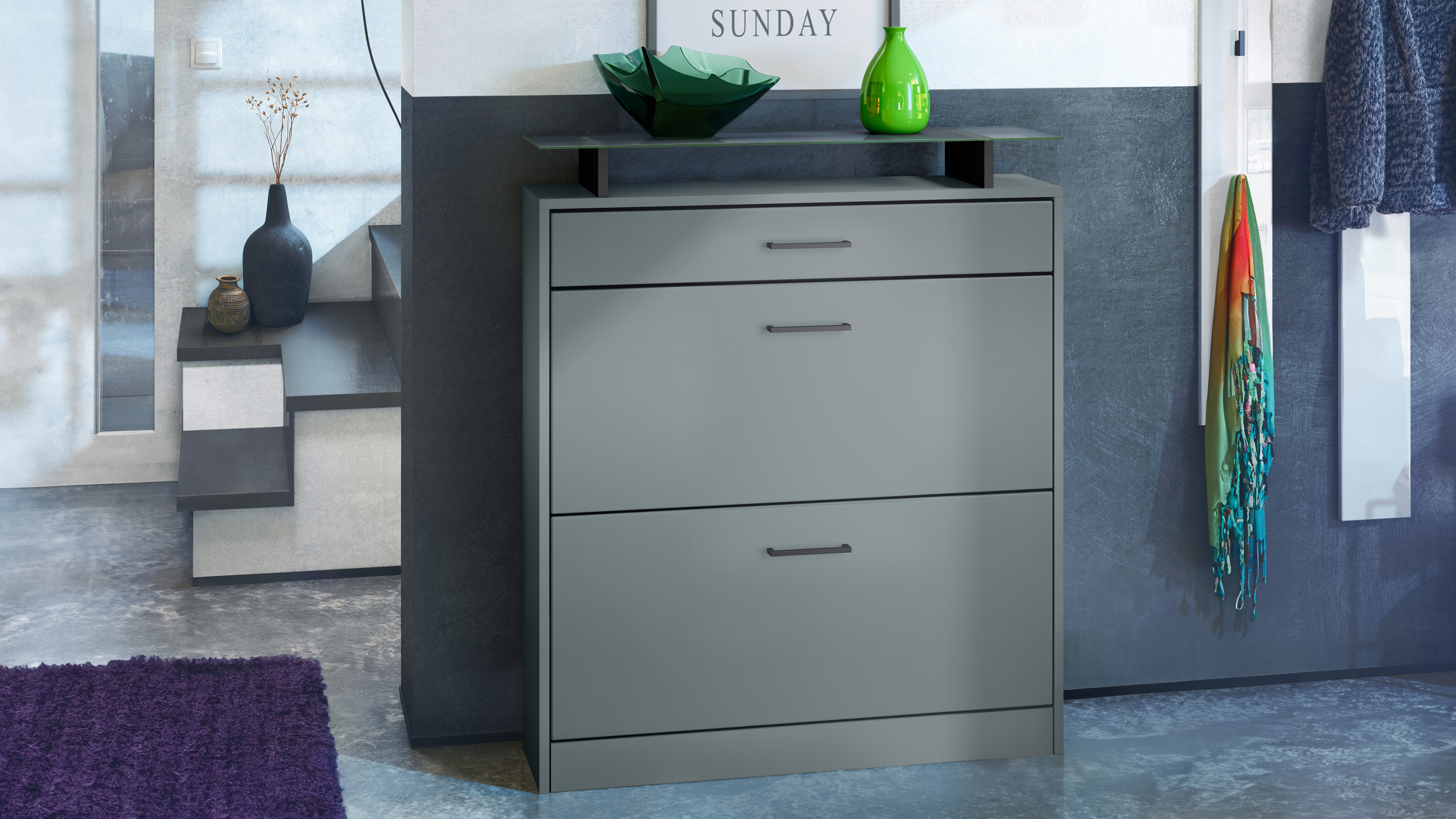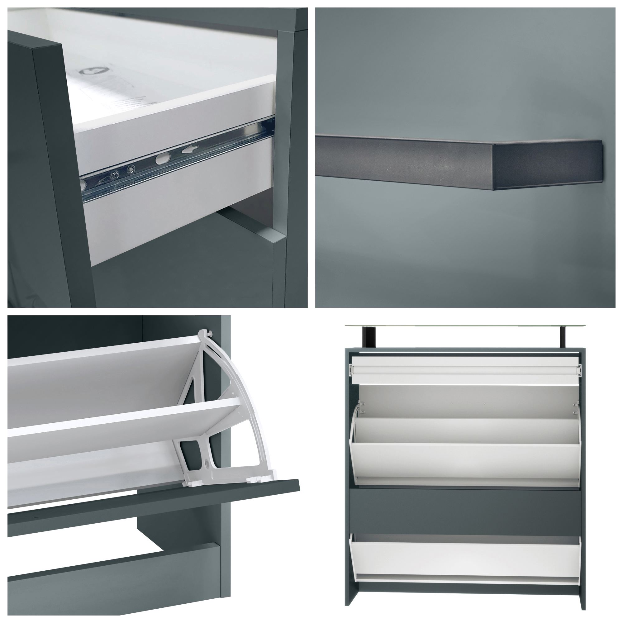 Das geräumige Schuhregal Enigma präsentiert sich als praktisches Möbelstück mit modernem Design für die Diele, hergestellt in Deutschland. Der schmale Schuhschrank ist mit zwei Schuhkippern mit doppelten Schuhhalterungen und einer leichtgängigen Schublade ausgestattet. Diese läuft dank Laufschienen aus Metall nahezu geräuschlos und ermöglicht eine einfache Handhabung. Der Schuhorganizer verfügt über dezente, schwarze Griffe. Zusätzlich gibt es eine aufgesetzte Glasablage für den Schuhschrank. Der Glasaufsatz bietet zusätzlichen Stauraum und lädt zum Dekorieren ein. Mit den beigefügten Beschlägen können Sie das Schuhregal für zusätzliche Sicherheit an der Wand befestigen. Eine Rückwand ist nicht enthalten.