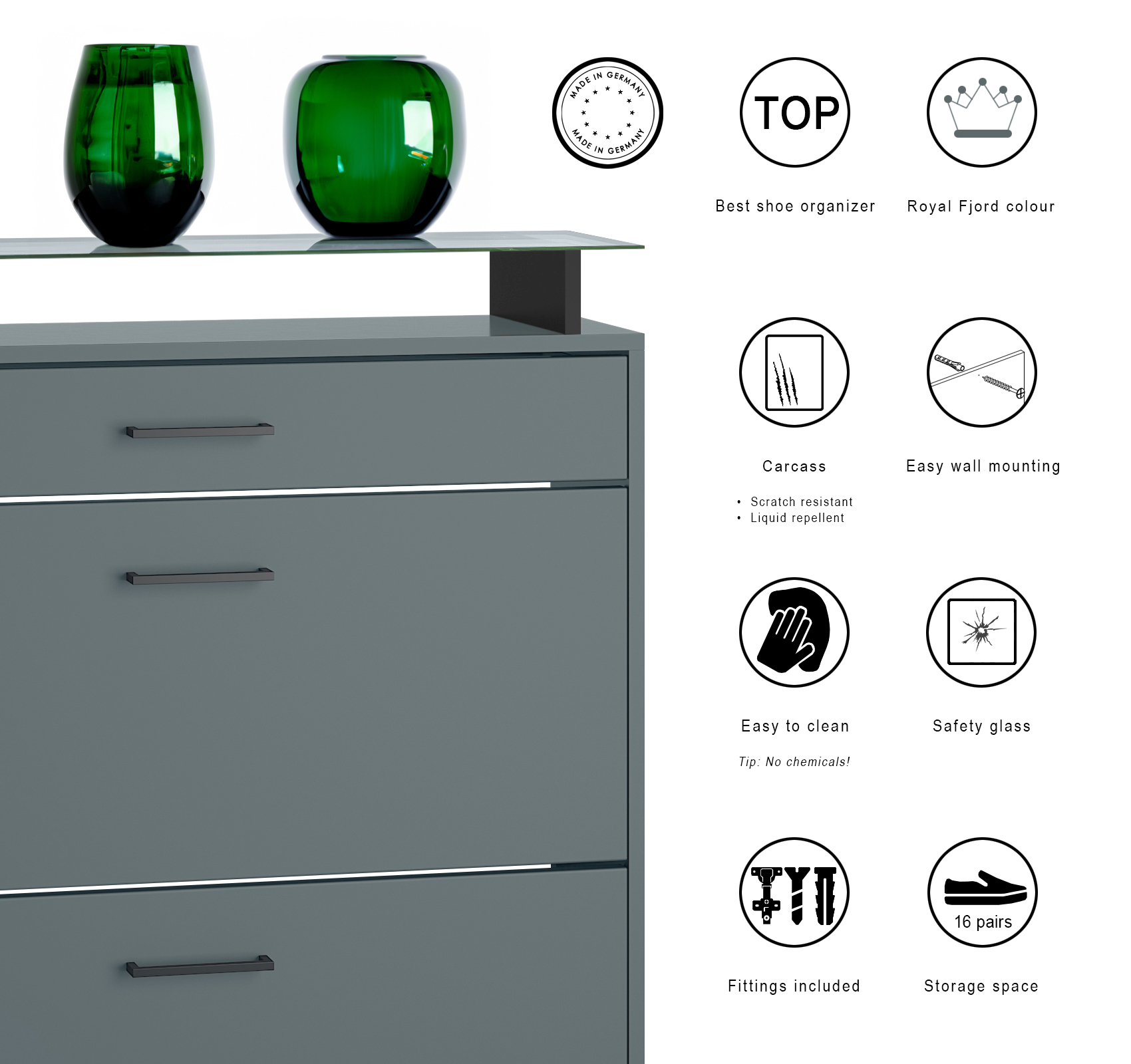 Produktinformationen "Enigma Schuhschrank für 16 Paar Schuhe mit 2 Klappen und 1 Schublade und Glasablage Fjord Grün (89 x 104 x 23 cm)"