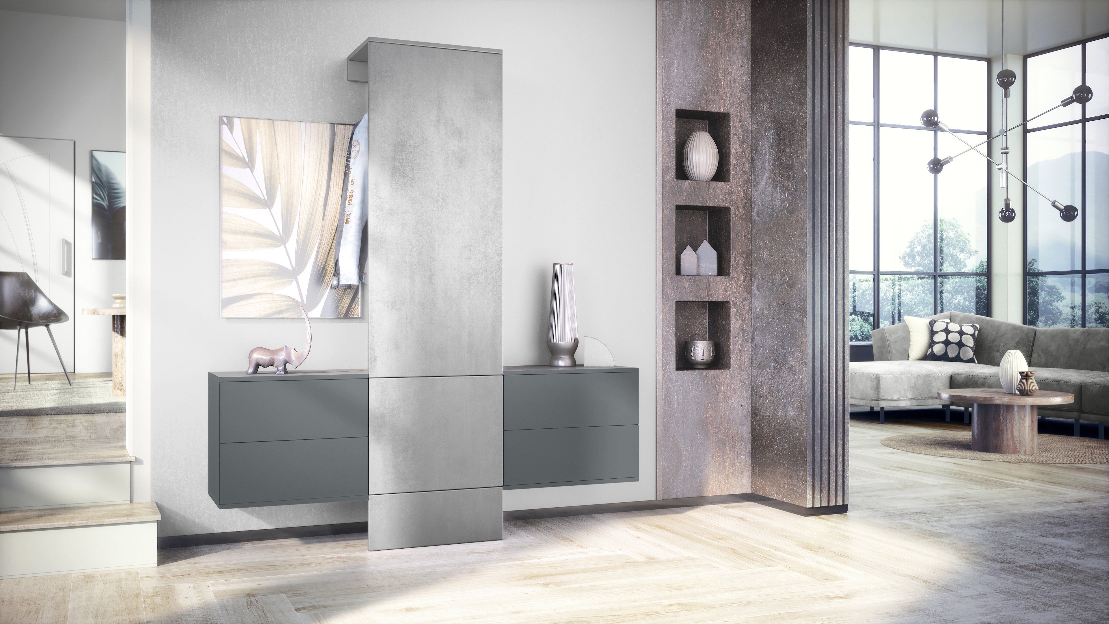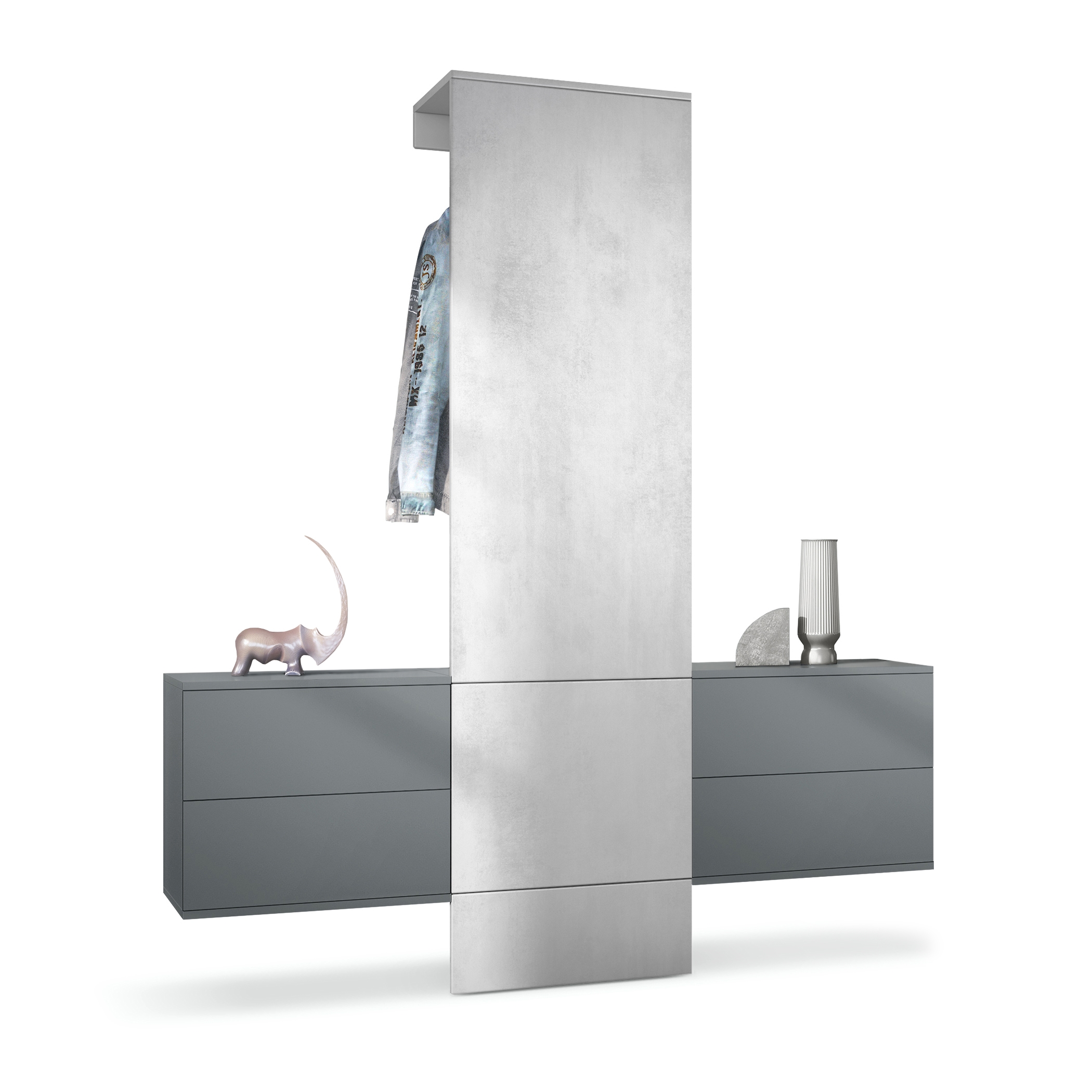 Produktinformationen "Garderobe Carlton Set 3 Anthrazit 4-tlg. 1 Paneel und 2 Schubkastenschränke Anthrazit matt/Beton Oxid Optik (157 x 193 x 35 cm)"