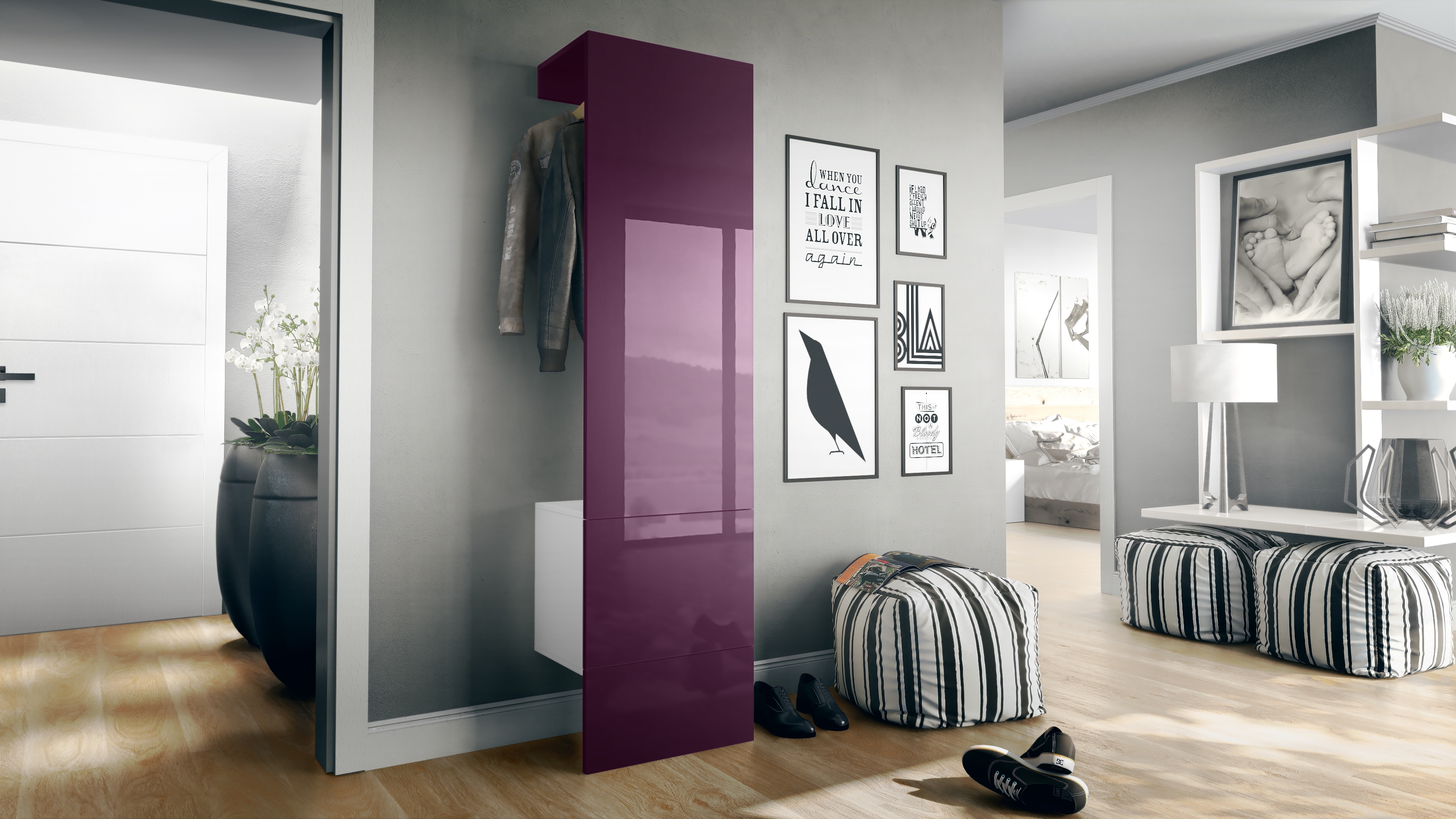 Produktinformationen "Garderobe Carlton Set 5 Weiß 1-tlg. mit integrierter Tür und 1 Kleiderstange Weiß matt/Brombeer Hochglanz (52 x 193 x 35 cm)"