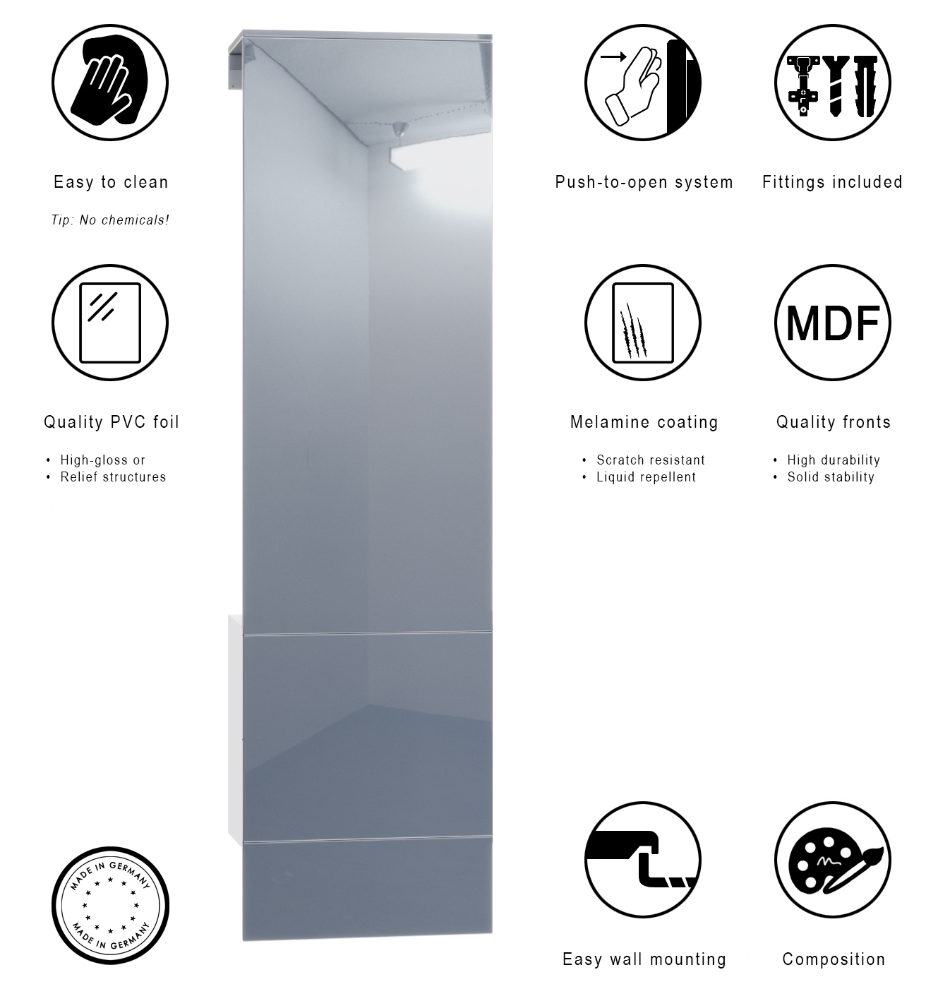 Für eine besondere Eleganz sorgen die Fronten des Garderobensets für den Flur, erhältlich in vielen verschiedenen Farbvarianten, die Ihnen eine Vielzahl an Kombinationsmöglichkeiten bieten. Durch die Oberflächenbeschichtung der einzelnen Flurmöbel erhalten Sie besonders pflegeleichte Produkte. Für die Reinigung können Sie auf Chemie verzichten - es reicht ein leicht angefeuchtetes Tuch, um die wasserfesten Oberflächen angemessen zu reinigen.