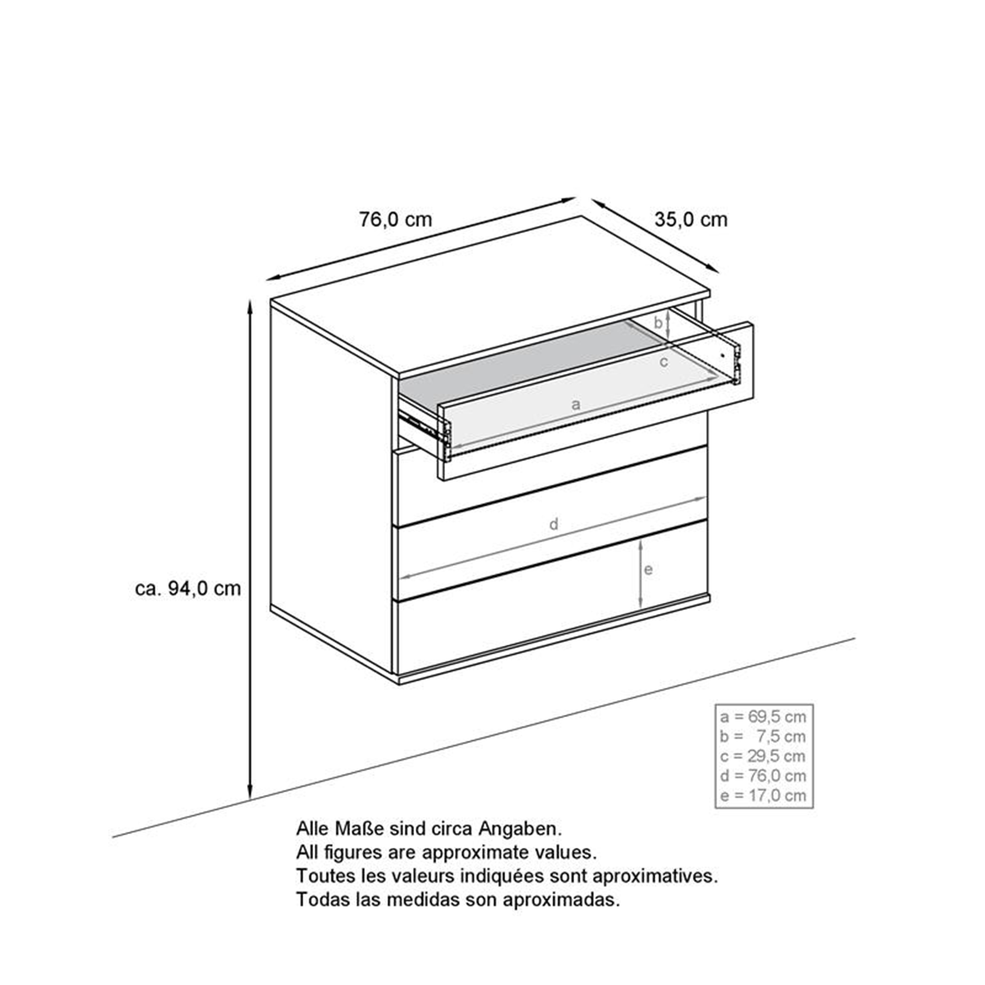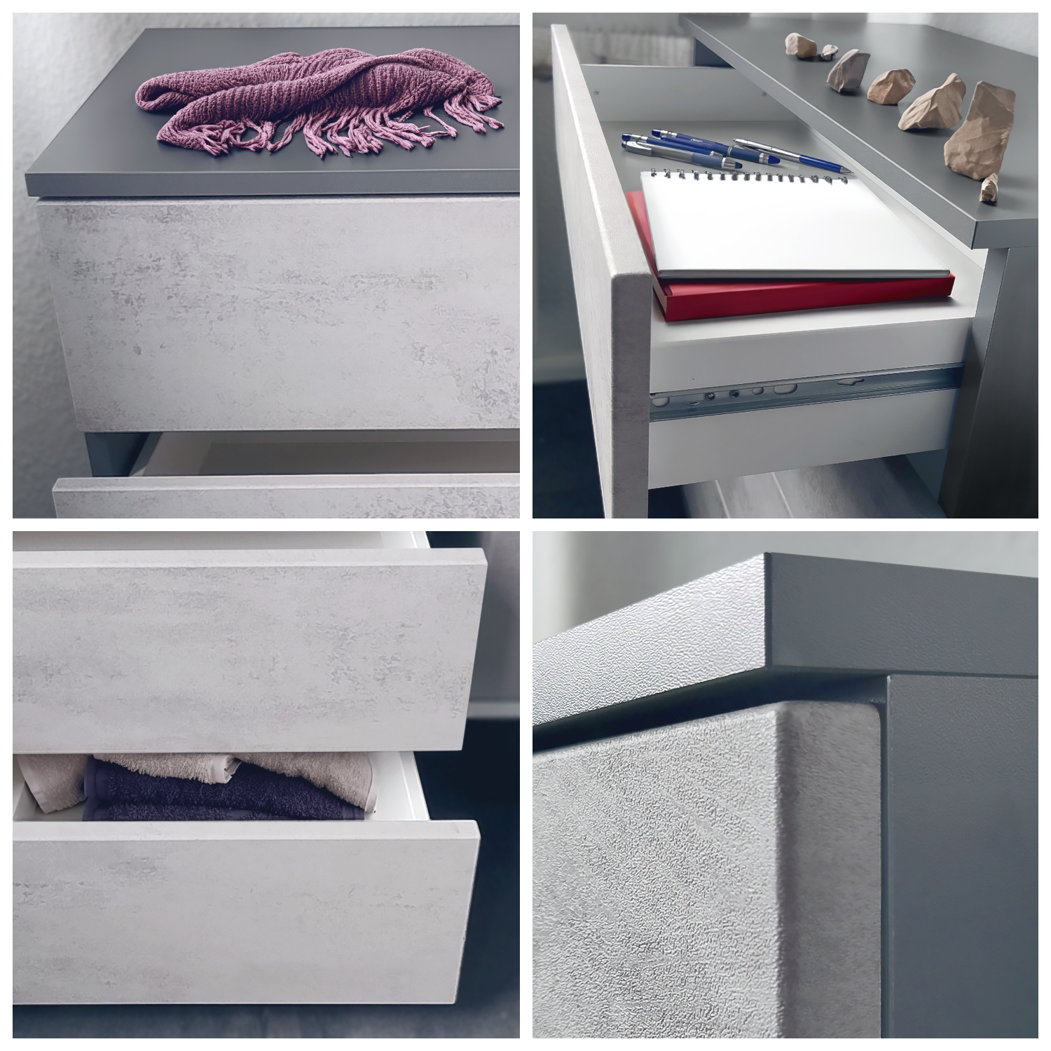 Das Horizon Möbelset bietet eine stilvolle und praktische Lösung für jeden Wohnraum, bestehend aus einer eleganten Kommode, zwei Wandpaneelen mit Garderobenhaken und einem modernen Wandspiegel. Jedes Möbelstück vereint modernes Design mit Funktionalität und ist in verschiedenen Farbvarianten erhältlich. Die geräumige, schwebende Kommode eignet sich für Wohnzimmer, Schlafzimmer, Flur oder Kinderzimmer. Sie verfügt über vier Schubladen, die dank des Push-to-Open-Systems mühelos geöffnet werden können. Die Schubladen gleiten nahezu geräuschlos auf stabilen Metallschienen. Die Kommode lässt sich ideal mit verschiedenen Einrichtungsstilen kombinieren und die pflegeleichten Oberflächen lassen sich einfach mit einem feuchten Tuch reinigen. Maße: Kommode (BxHxT): 76 x 94 x 35 cm, Schublade innen (BxHxT): 69,5 x 7,5 x 29,5 cm. Die Wandpaneele des Sets bestehen aus zwei Paneelen mit sechs Garderobenhaken, ideal für Jacken, Mäntel und Taschen. Das Ablagefach darüber bietet Platz für Zubehör wie Handschuhe oder Schals. Im Lieferumfang sind Materialien für die Wandmontage enthalten. Maße: Garderobenpaneel (BxHxT): 24 x 140 x 2 cm. Der Wandspiegel mit abgerundeten Rahmenkanten eignet sich für Diele, Schlafzimmer oder Bad und kann sowohl senkrecht als auch waagrecht aufgehängt werden. Die pflegeleichte Oberfläche lässt sich mit einem feuchten Tuch reinigen. Maße: Spiegel (BxH): 89 x 45 cm. Das Horizon Möbelset vereint Funktionalität und Design und ist eine perfekte Ergänzung für jedes Zuhause.