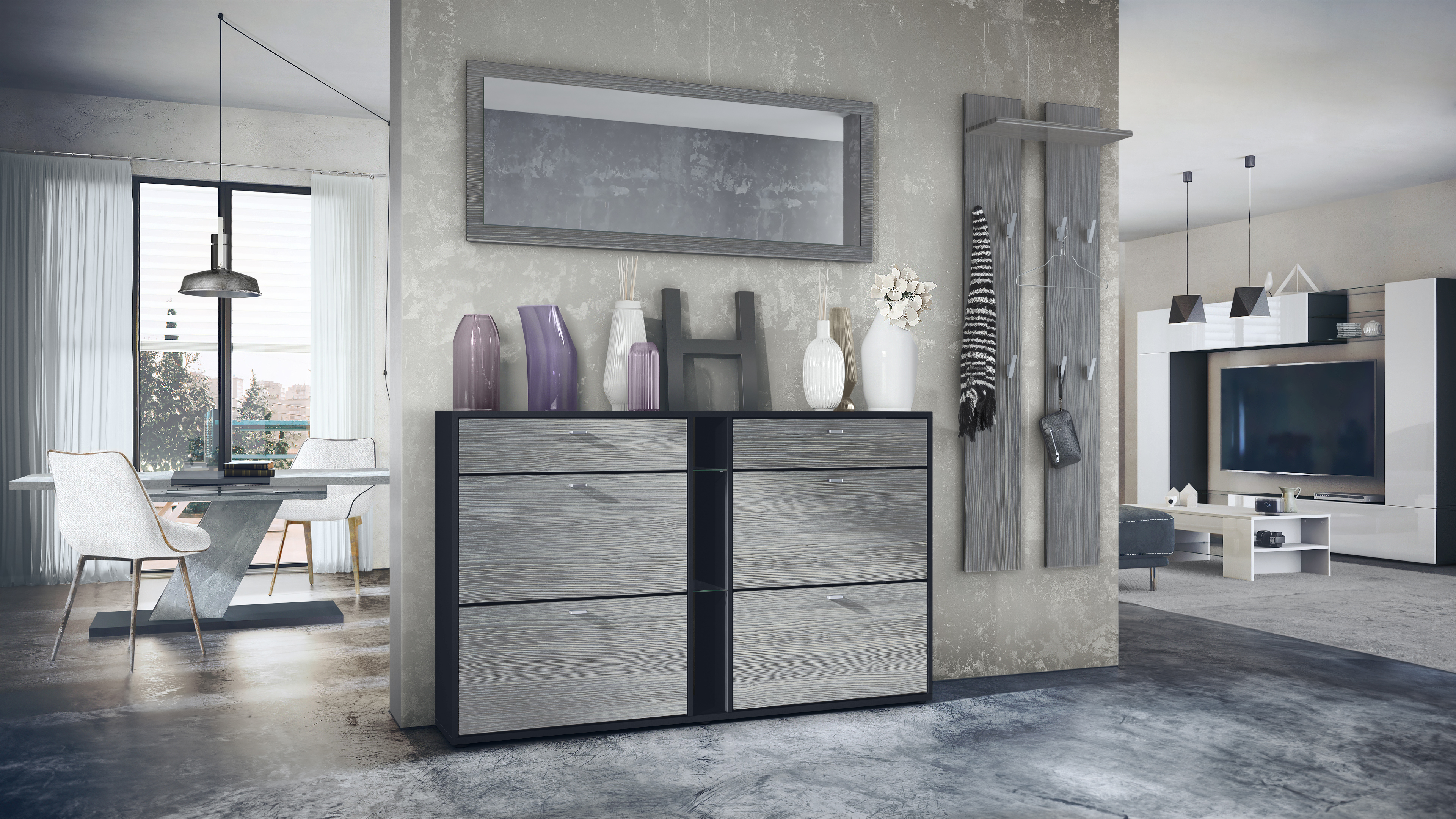 Der Schuhschrank präsentiert sich als moderner Aufbewahrungsort für bis zu 24 Paar Schuhe. Die silberfarbenen Griffe und die Glasablagen verleihen ihm eine zeitgemäße Note. Der elegante Wandspiegel mit abgerundeten Rahmenkanten setzt stilvolle Akzente und eignet sich ideal für Diele, Schlafzimmer oder Wohnzimmer.