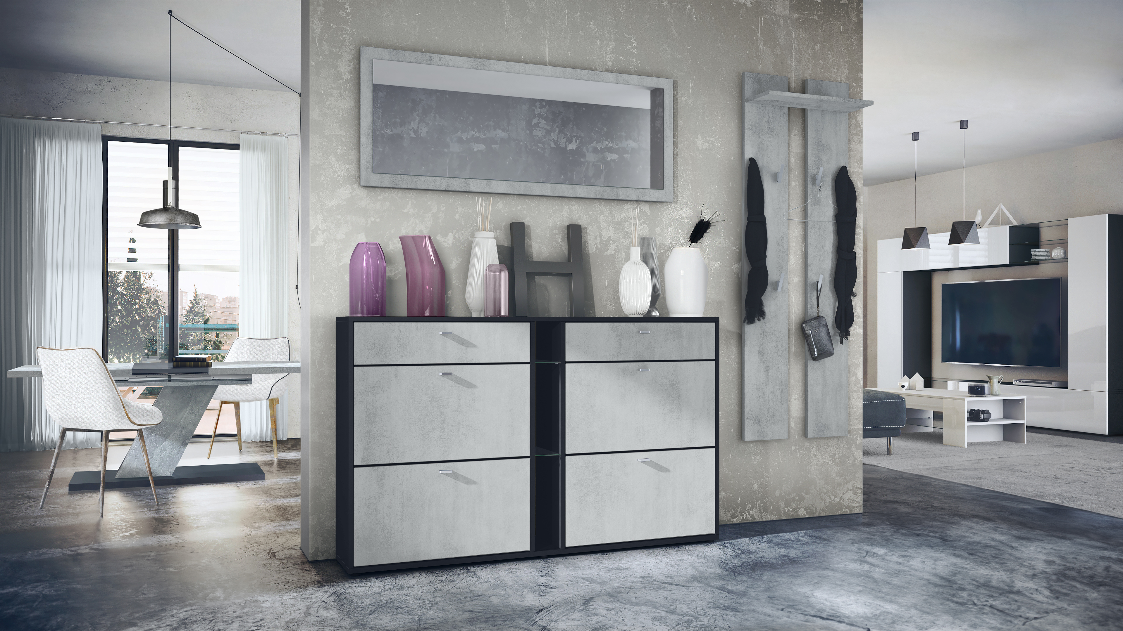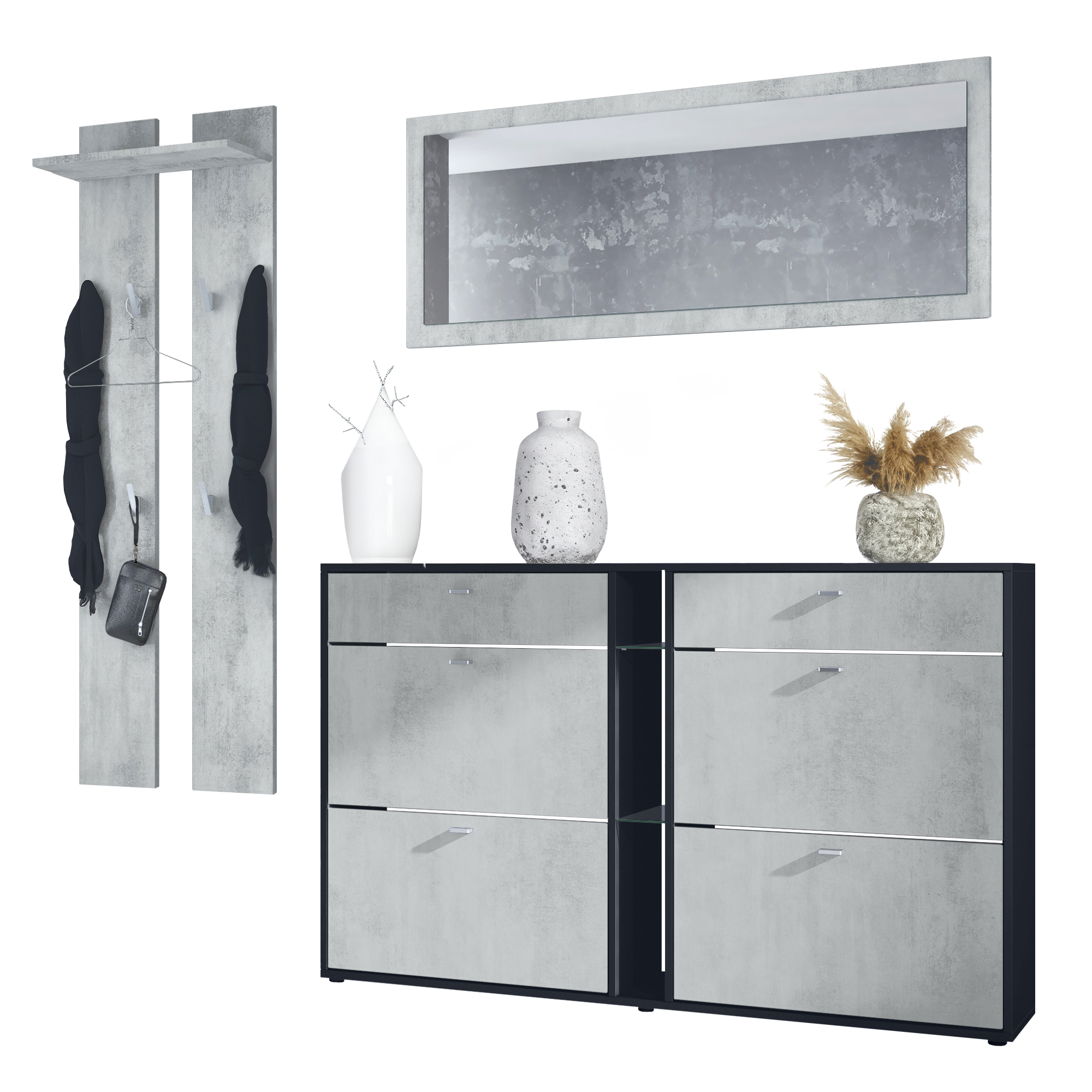 Produktinformationen "Garderobenset 3-tlg. Orlando mit Schuhschrank, Wandpaneel und Wandspiegel Schwarz matt/Beton Oxid Optik"