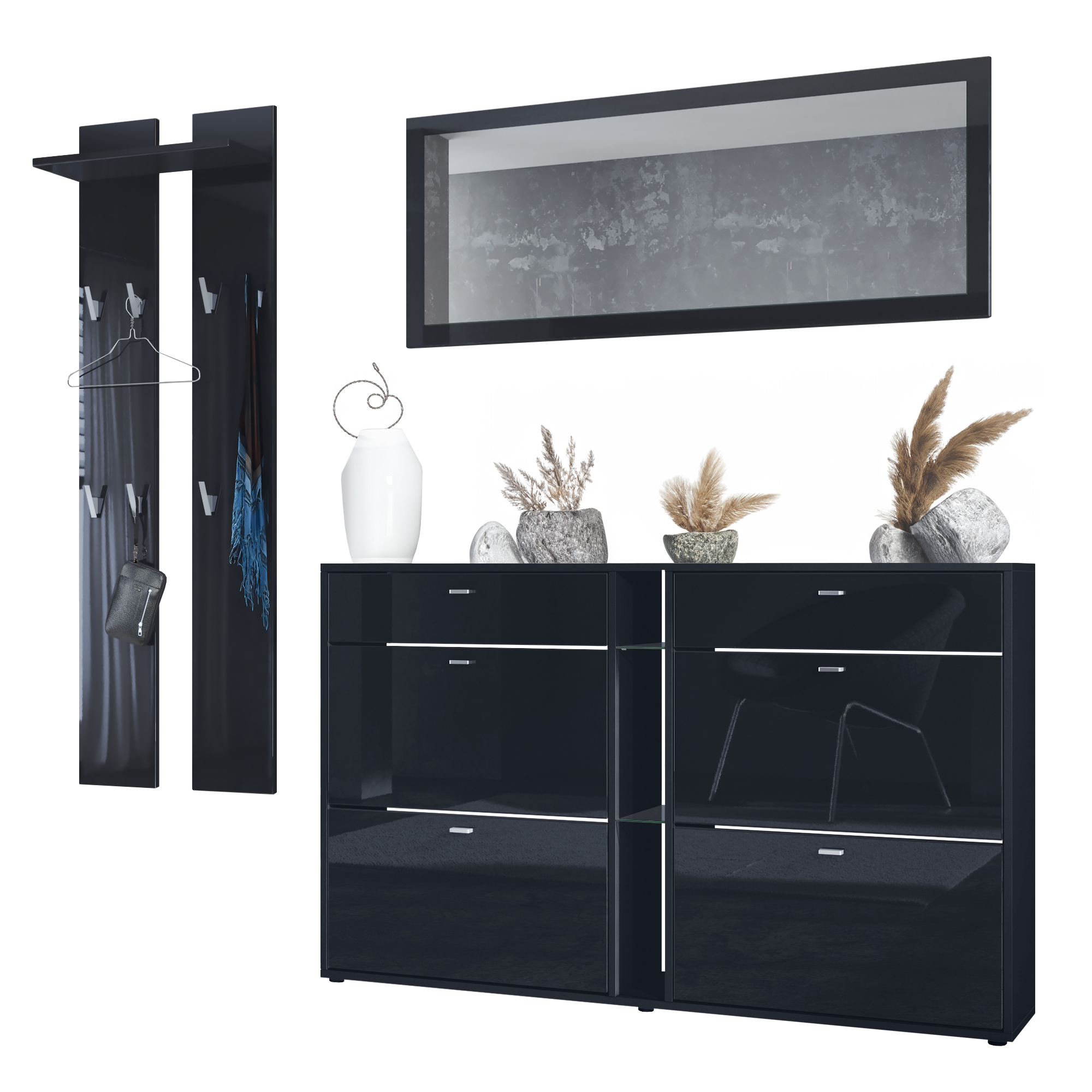 Produktinformationen "Garderobenset 3-tlg. Orlando mit Schuhschrank, Wandpaneel und Wandspiegel Schwarz matt/Schwarz Hochglanz"