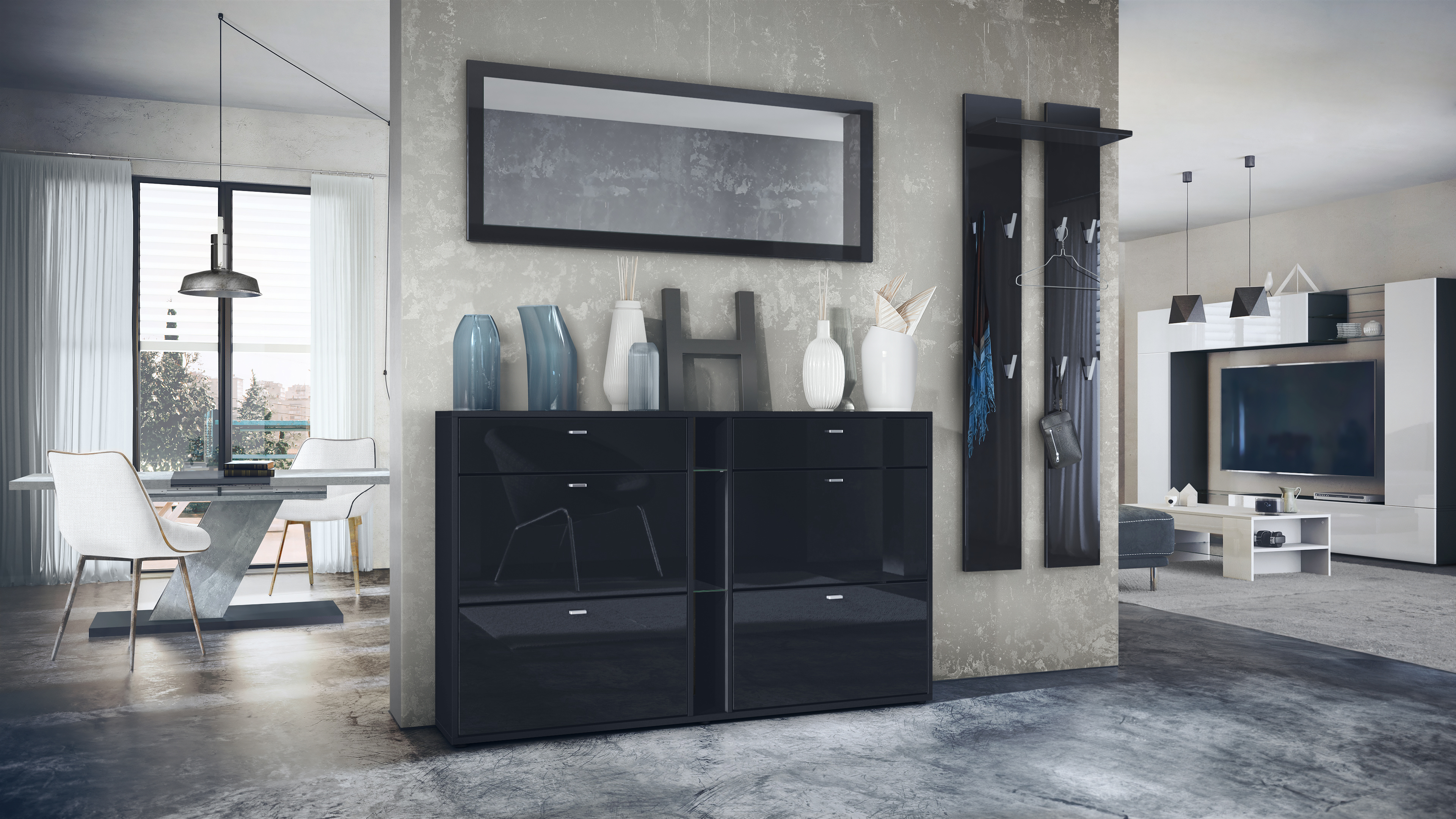 Der Schuhschrank präsentiert sich als moderner Aufbewahrungsort für bis zu 24 Paar Schuhe. Die silberfarbenen Griffe und die Glasablagen verleihen ihm eine zeitgemäße Note. Der elegante Wandspiegel mit abgerundeten Rahmenkanten setzt stilvolle Akzente und eignet sich ideal für Diele, Schlafzimmer oder Wohnzimmer.