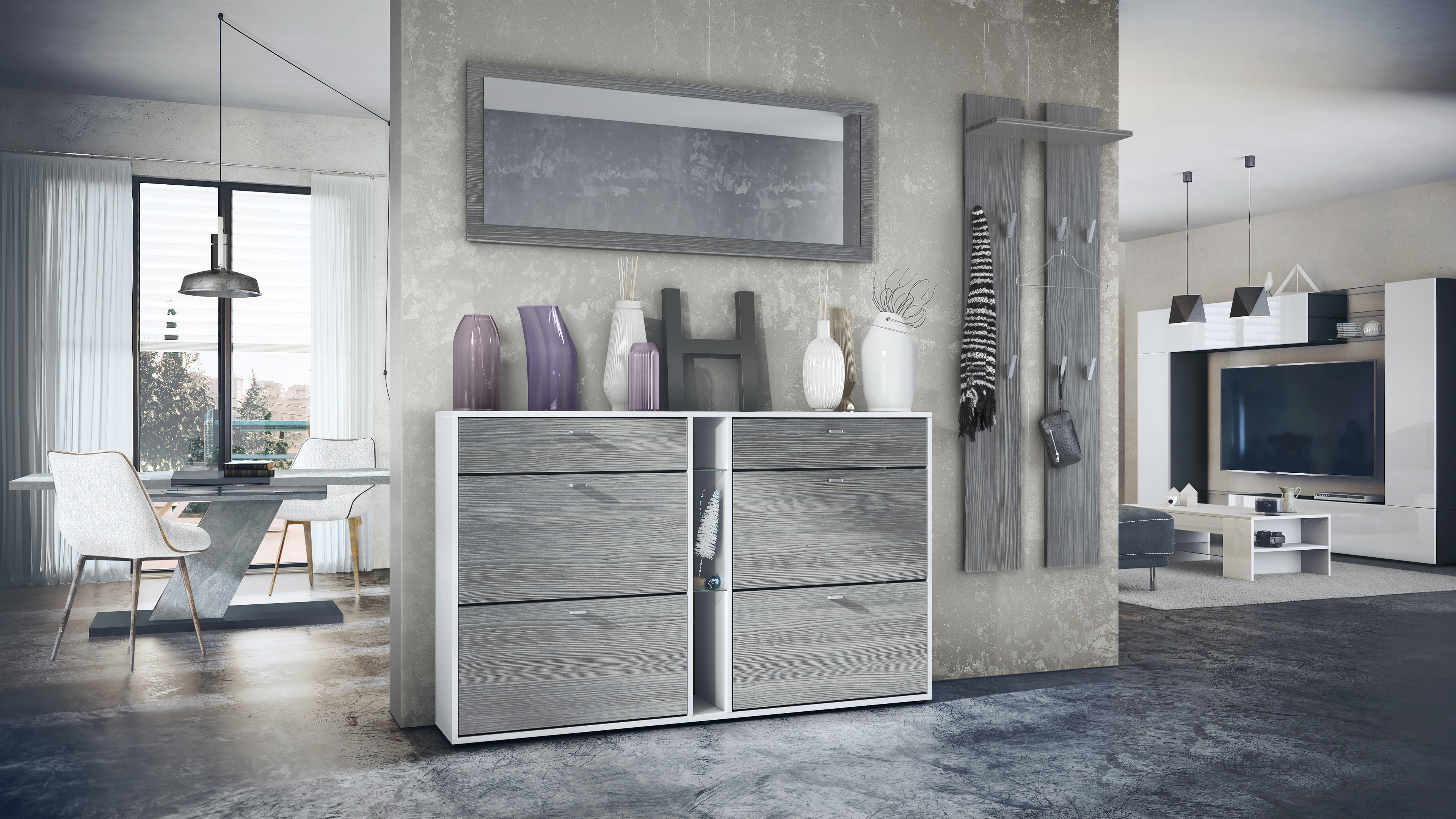 Der Schuhschrank präsentiert sich als moderner Aufbewahrungsort für bis zu 24 Paar Schuhe. Die silberfarbenen Griffe und die Glasablagen verleihen ihm eine zeitgemäße Note. Der elegante Wandspiegel mit abgerundeten Rahmenkanten setzt stilvolle Akzente und eignet sich ideal für Diele, Schlafzimmer oder Wohnzimmer.