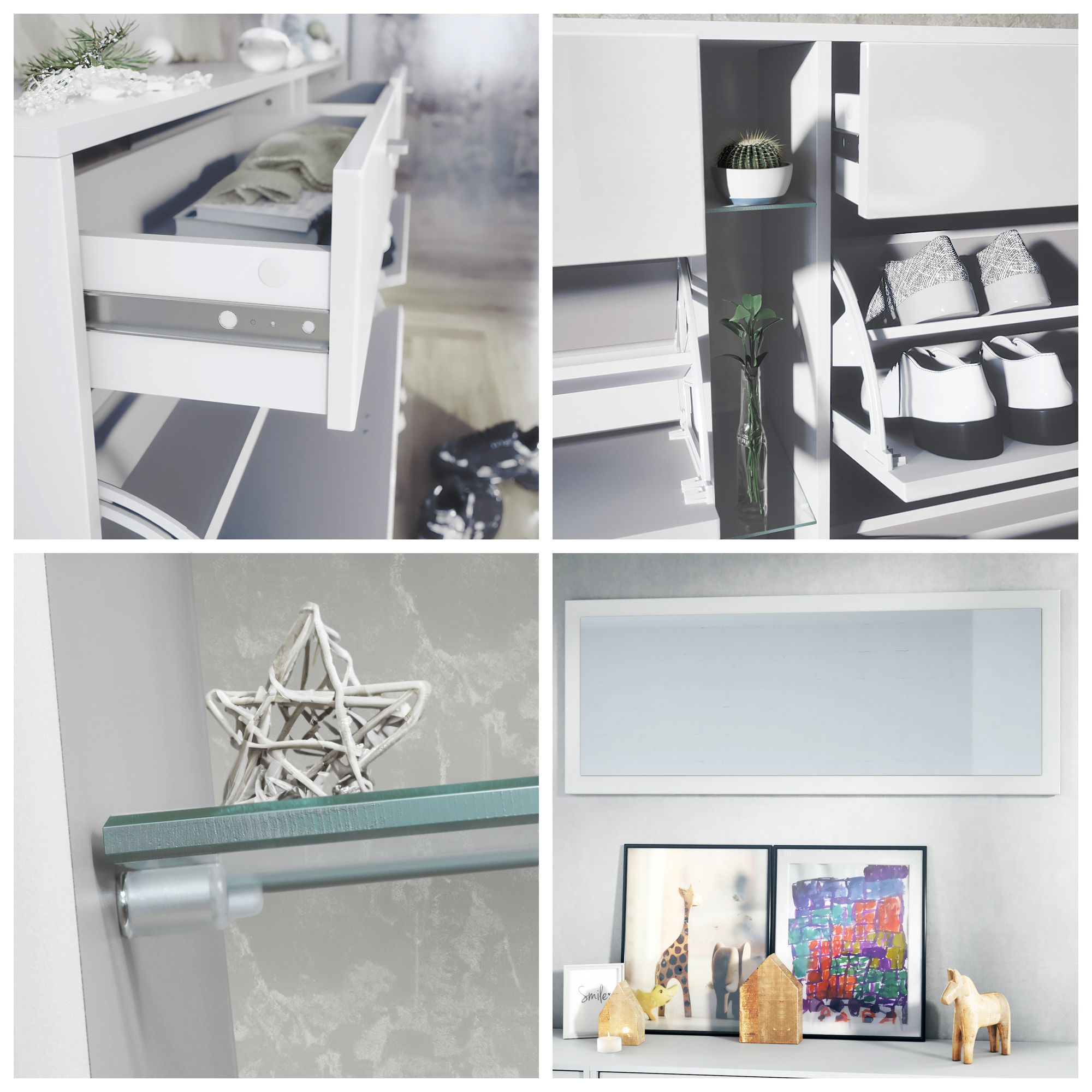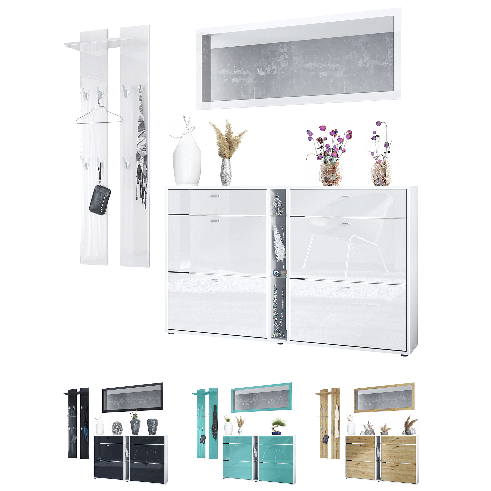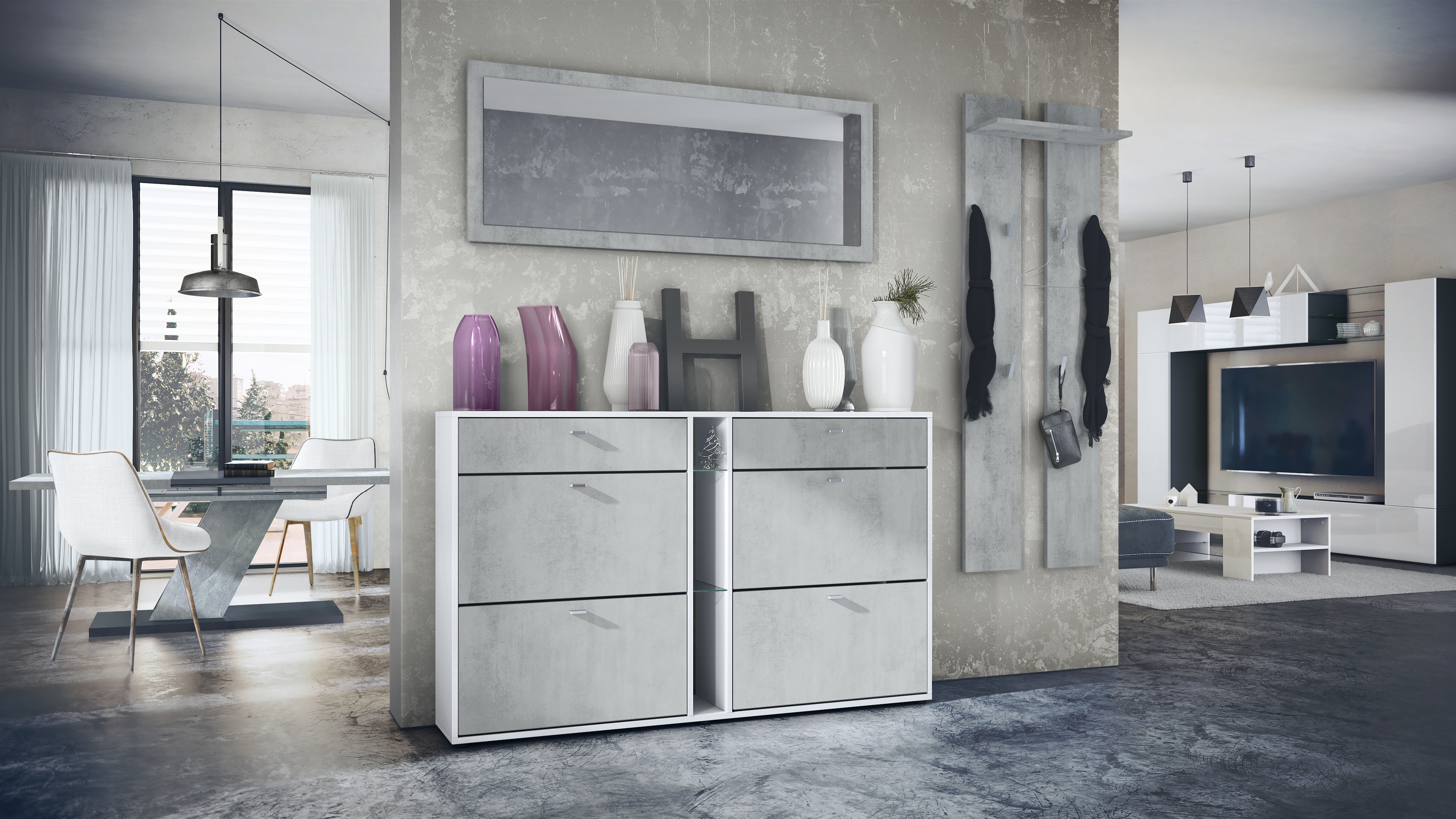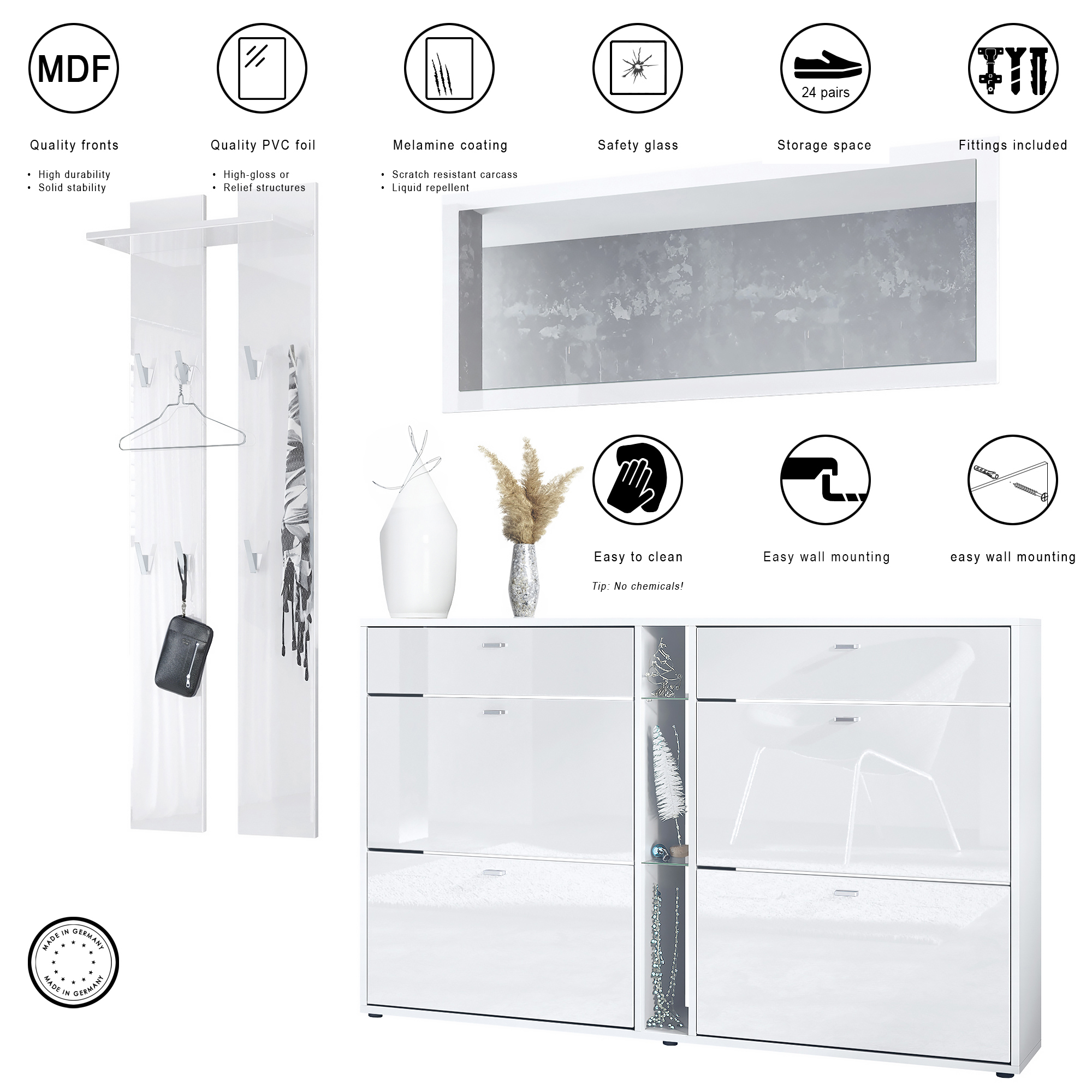 Der Schuhschrank präsentiert sich als moderner Aufbewahrungsort für bis zu 24 Paar Schuhe. Die silberfarbenen Griffe und die Glasablagen verleihen ihm eine zeitgemäße Note. Der elegante Wandspiegel mit abgerundeten Rahmenkanten setzt stilvolle Akzente und eignet sich ideal für Diele, Schlafzimmer oder Wohnzimmer.