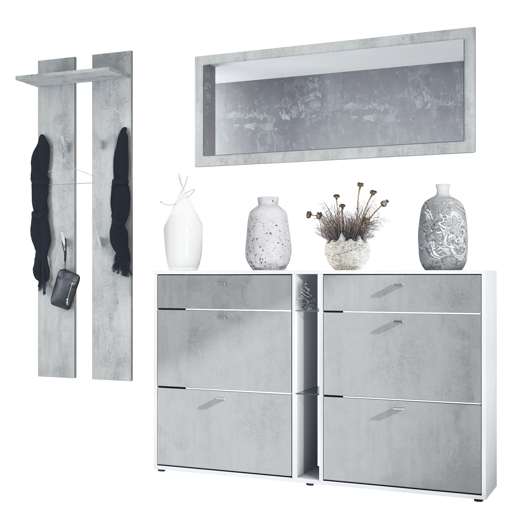 Produktinformationen "Garderobenset 3-tlg. Orlando mit Schuhschrank, Wandpaneel und Wandspiegel Weiß matt/Beton Oxid Optik"