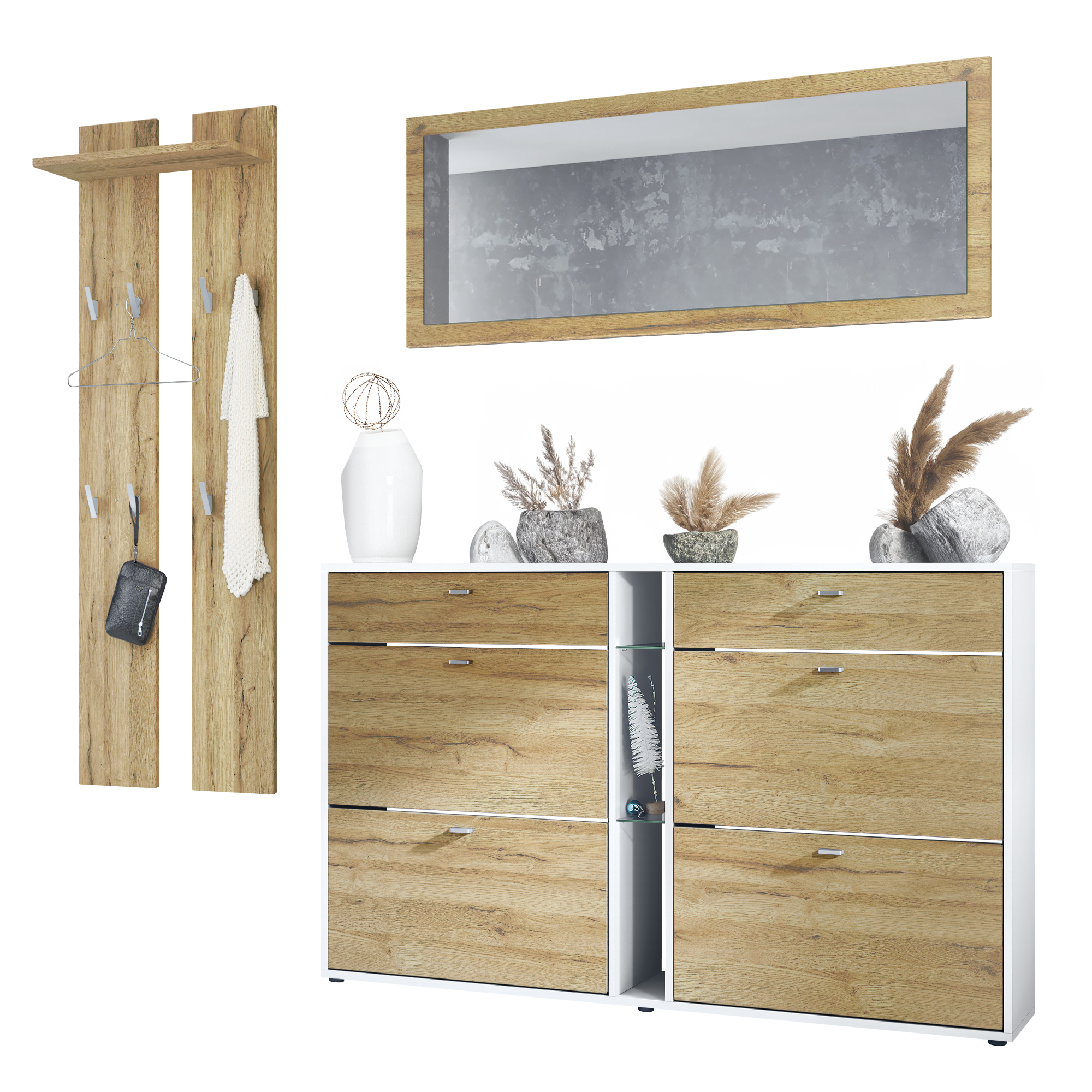 Produktinformationen "Garderobenset 3-tlg. Orlando mit Schuhschrank, Wandpaneel und Wandspiegel Weiß matt/Eiche Natur"