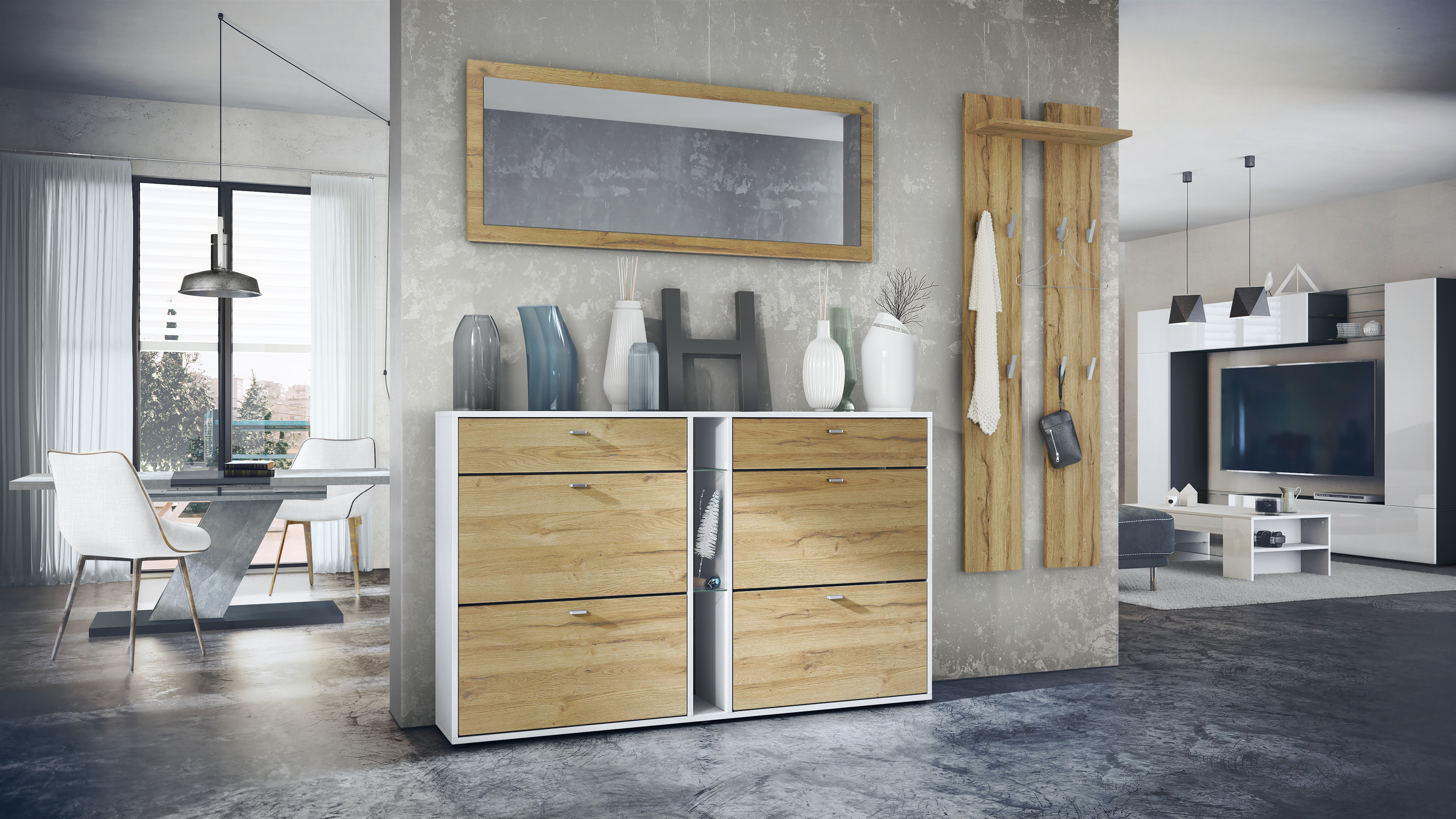 Der Schuhschrank präsentiert sich als moderner Aufbewahrungsort für bis zu 24 Paar Schuhe. Die silberfarbenen Griffe und die Glasablagen verleihen ihm eine zeitgemäße Note. Der elegante Wandspiegel mit abgerundeten Rahmenkanten setzt stilvolle Akzente und eignet sich ideal für Diele, Schlafzimmer oder Wohnzimmer.
