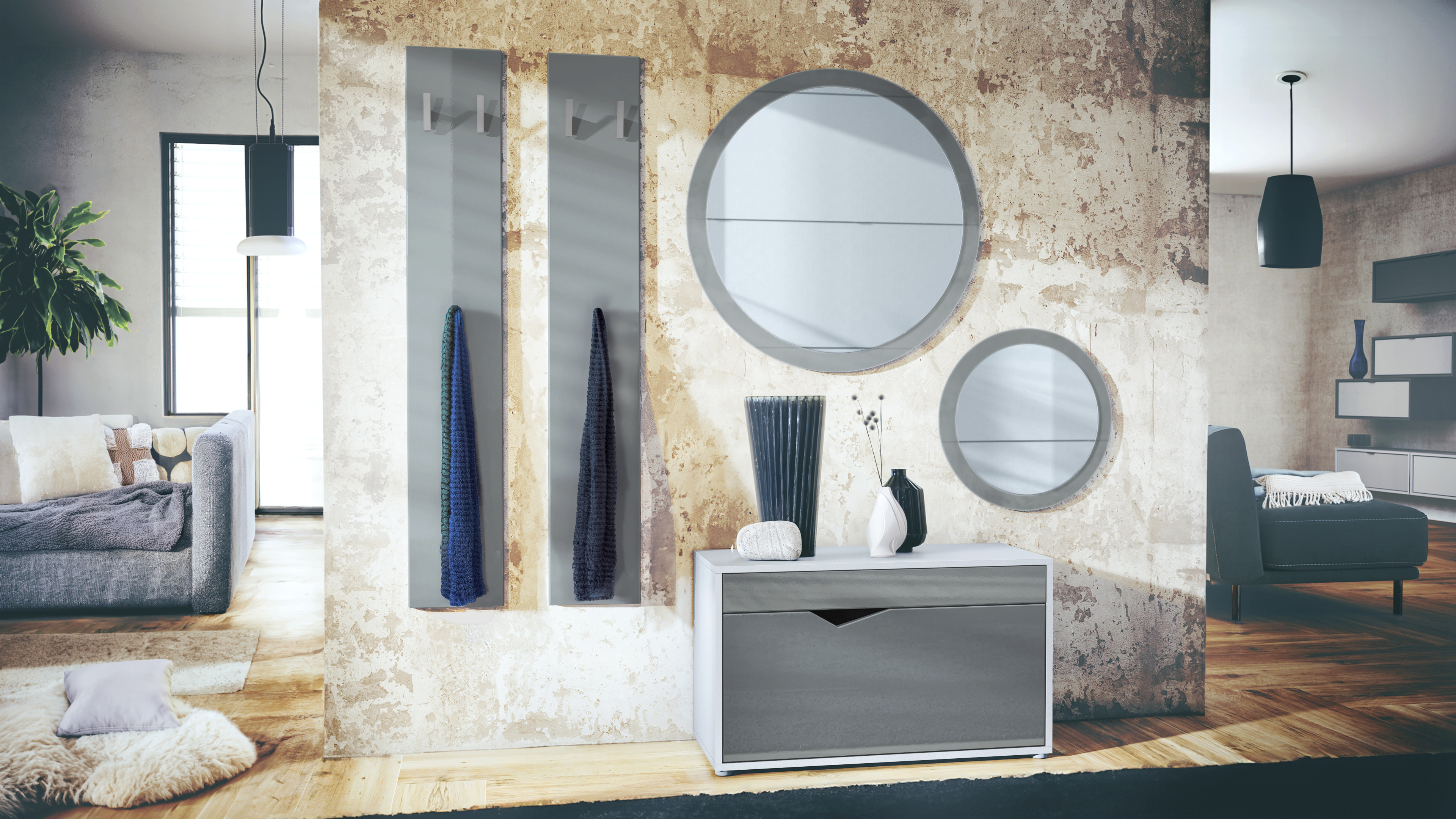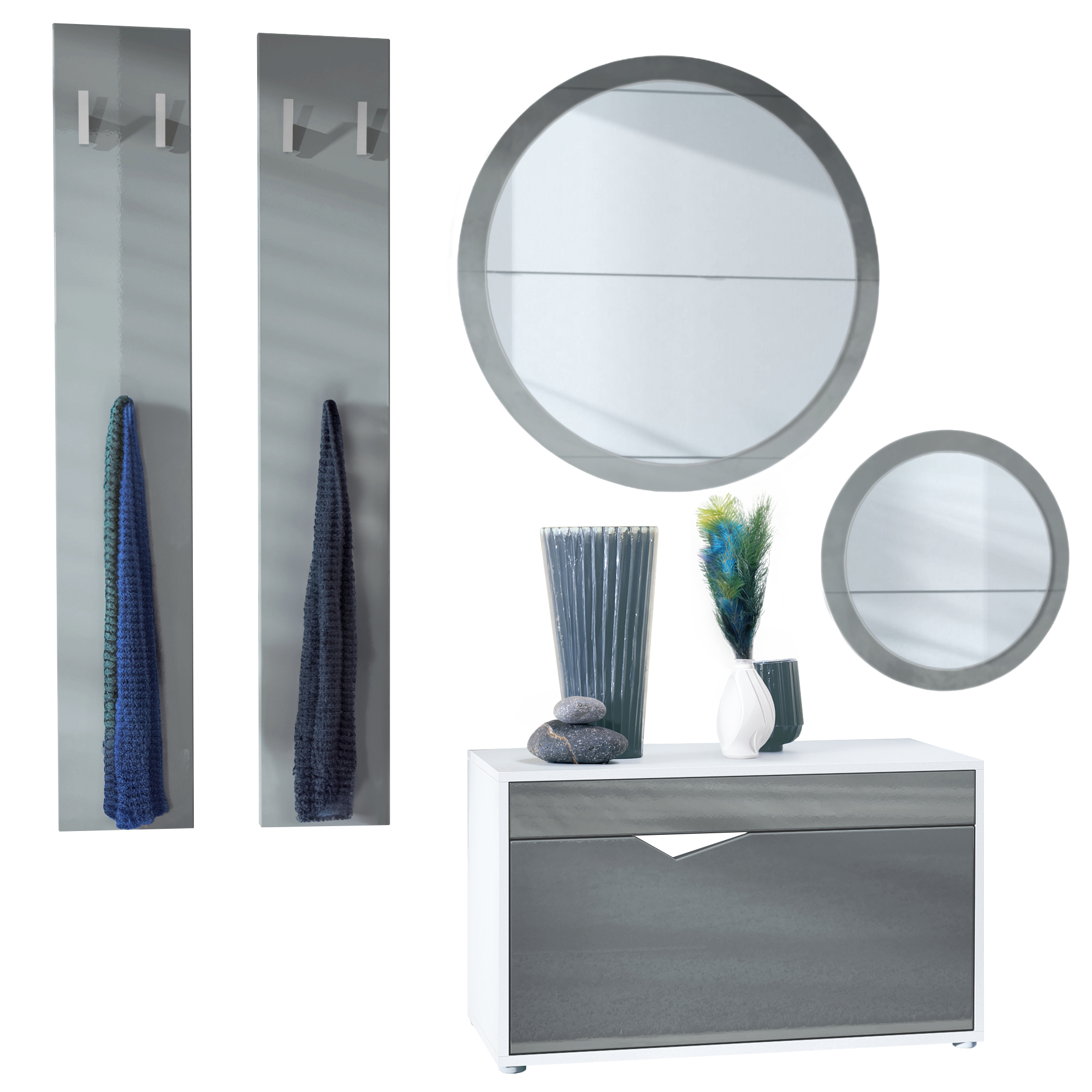 Produktinformationen "Garderobenset 5-tlg. Espoo mit Schuhbank, 2 Wandpaneel und 2 Runde Wandspiegel Weiß matt/Grau Hochglanz"