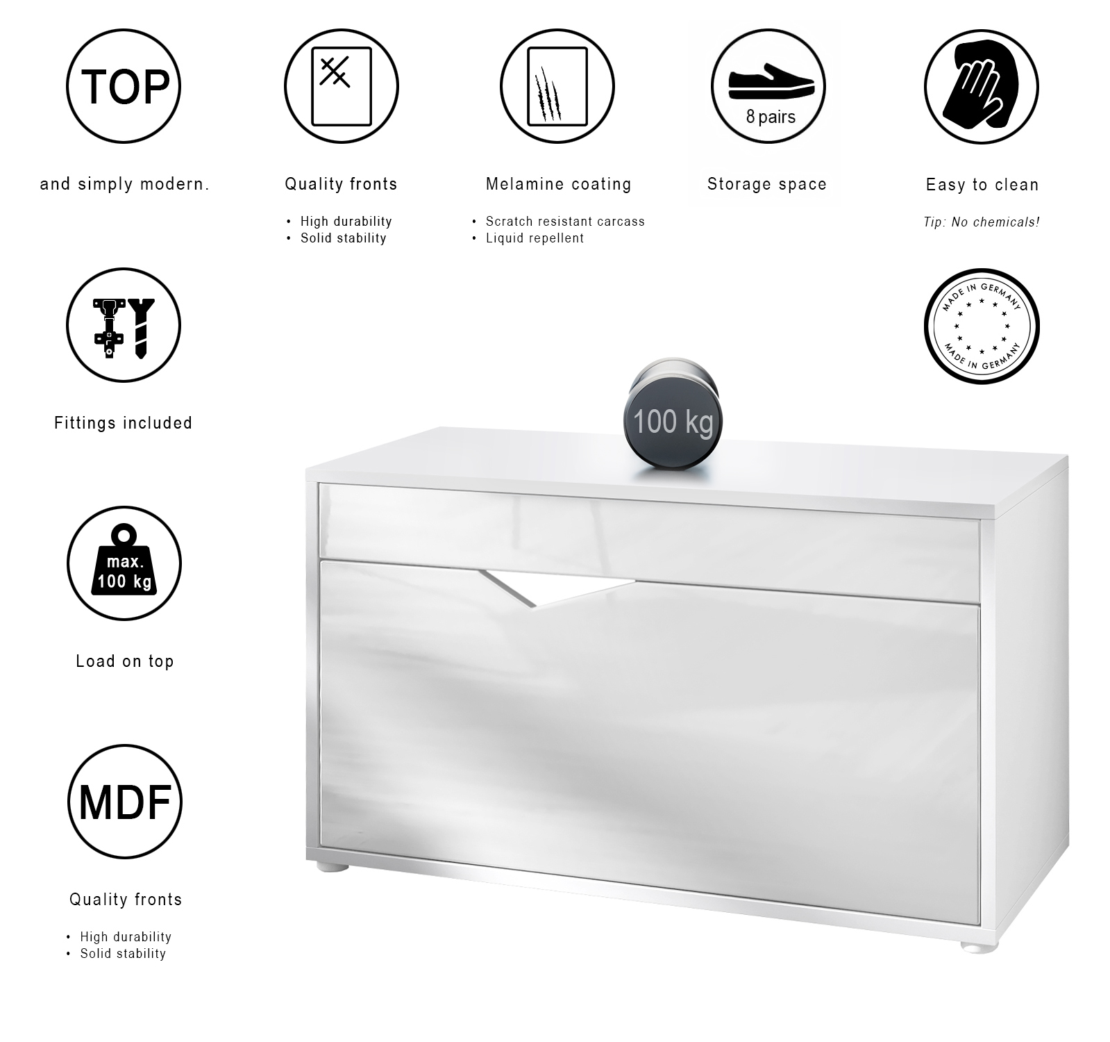 Das Highlight der Schuhbank ist die einzigartige dreieckige Aussparung, die als eleganter Griff fungiert und ein nahtloses Öffnen der Klappe ermöglicht.