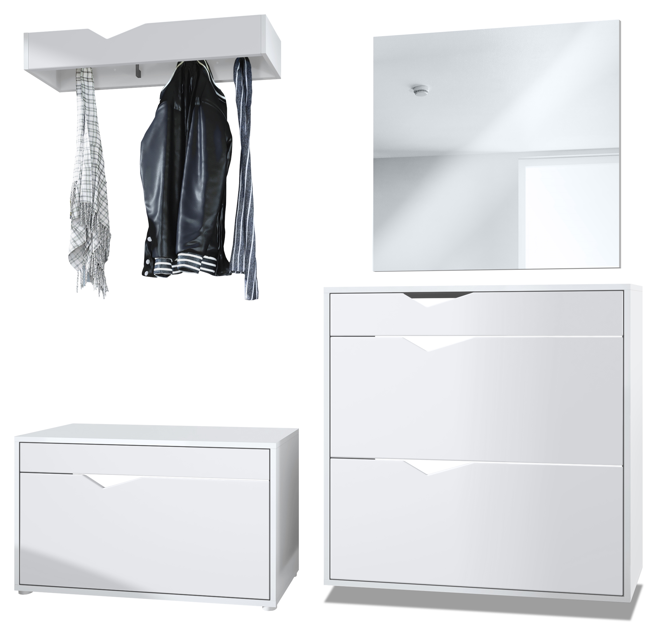 Produktinformationen "Garderobenset Kolmio 1 Schuhbank, 1 Spiegel und 1 Wandgarderobe Weiß matt (190 x 185 x 33 cm)"