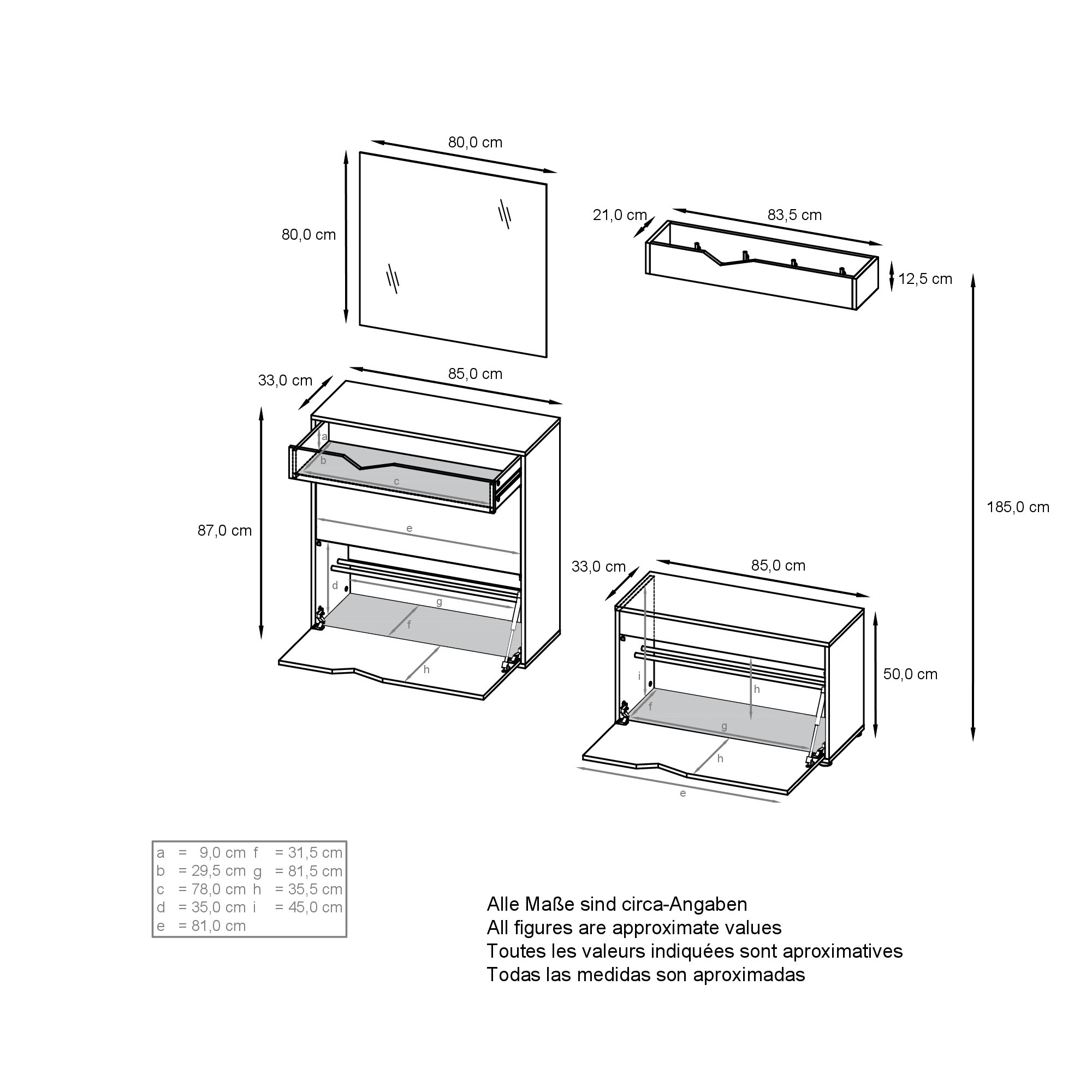 Die Gesamtmaße des Kolmio Garderobensets (BxHxT) betragen 190 x 185 x 33 cm, wie abgebildet.