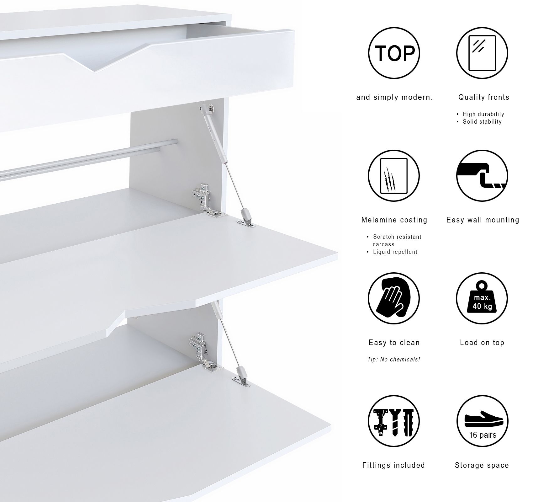 Der Schuhschrank schwebt förmlich an der Wand, verleiht Ihrem Flur eine futuristische Note und sorgt gleichzeitig für sicheren Halt.