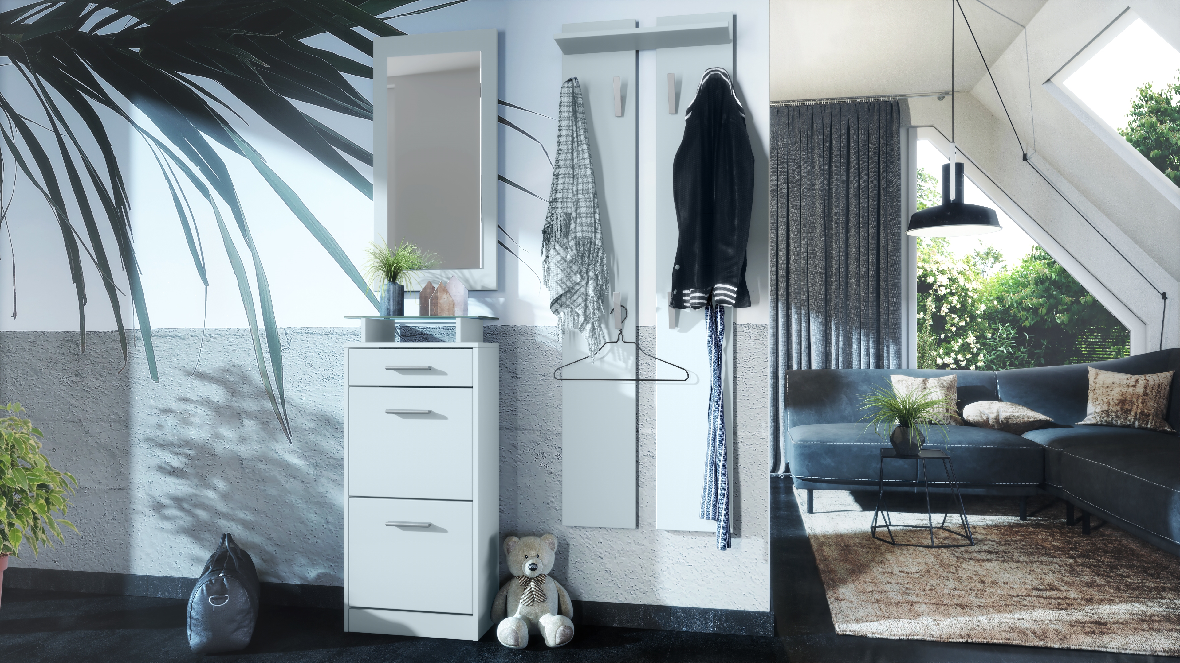 Vervollständigen Sie Ihren Flur mit dem stilvollen Garderoben-Set Loret V2 Mini. Schaffen Sie Ordnung und Eleganz zugleich.
