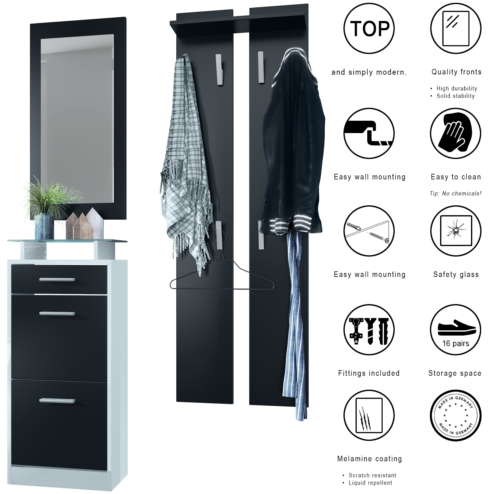 Die moderne Garderobe Loret V2 Mini besteht aus einem Schuhschrank und einem Garderobenpaneel mit stilvollen Haken, perfekt für Ihren Flur oder die Diele. Der Schuhschrank bietet Platz für bis zu 8 Paar Schuhe dank 2 doppelreihiger Kippvorrichtungen. Accessoires finden im leichtgängigen Schubkasten perfekte Aufbewahrung. Jacken und Mäntel lassen sich bequem am Garderobenpaneel abnehmen. Sperrige Accessoires finden auf der praktischen Hutablage Platz. Ein vielseitig montierbarer Spiegel in schicker Rahmenoptik rundet das Garderobenset ab.