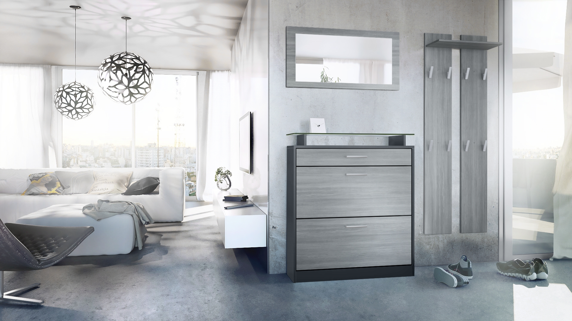 Die moderne Garderobe Loret mini besteht aus einem Schuhschrank, zwei Wandpaneelen mit jeweils vier Garderobenhaken, einem Ablagefach und einem zusätzlich dekorativen Wandspiegel, hergestellt in Deutschland. Alle vier Flurmöbel lassen sich individuell zusammenstellen und bieten grenzenlose Gestaltungsmöglichkeiten für Ihren Flur oder die Diele. Der Schuhschrank bietet mit zwei Schuhkippern, einer Schublade und einer Glasablage genug Platz für bis zu 16 Paar Schuhe und weitere Accessoires. Der Schuhschrank enthält keine Rückwand.